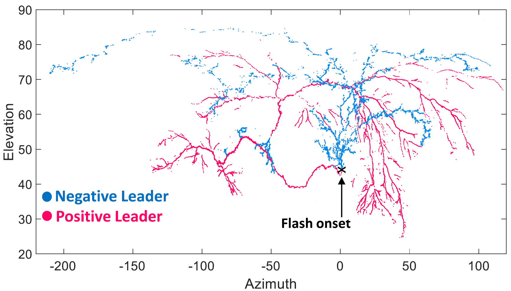 The 8-channel system with its antennas could be moved around, but up to now it was operated in a fixed location at the Duke University in Durham. On April 12, 2019 at 21:24:40 UTC, the lightning flash analyzed here was recorded. It is noteworthy that this entire flash took place inside a storm cloud, so only a diffusely illuminated cloud could be seen. But, with VHF radio measurements, the entire structure was captured which is shown in the diagram. With azimuth and elevation, every position in the sky is clearly defined. The timing sequence of this lightning can be seen in the linked 48 sec video that shows in slow motion the 1 second duration lightning flash. Each dot in the movie is a different detected and located radio source from the lightning flash. When all shown together, these dots make a very clear movie of the space and time structure of the lightning event.