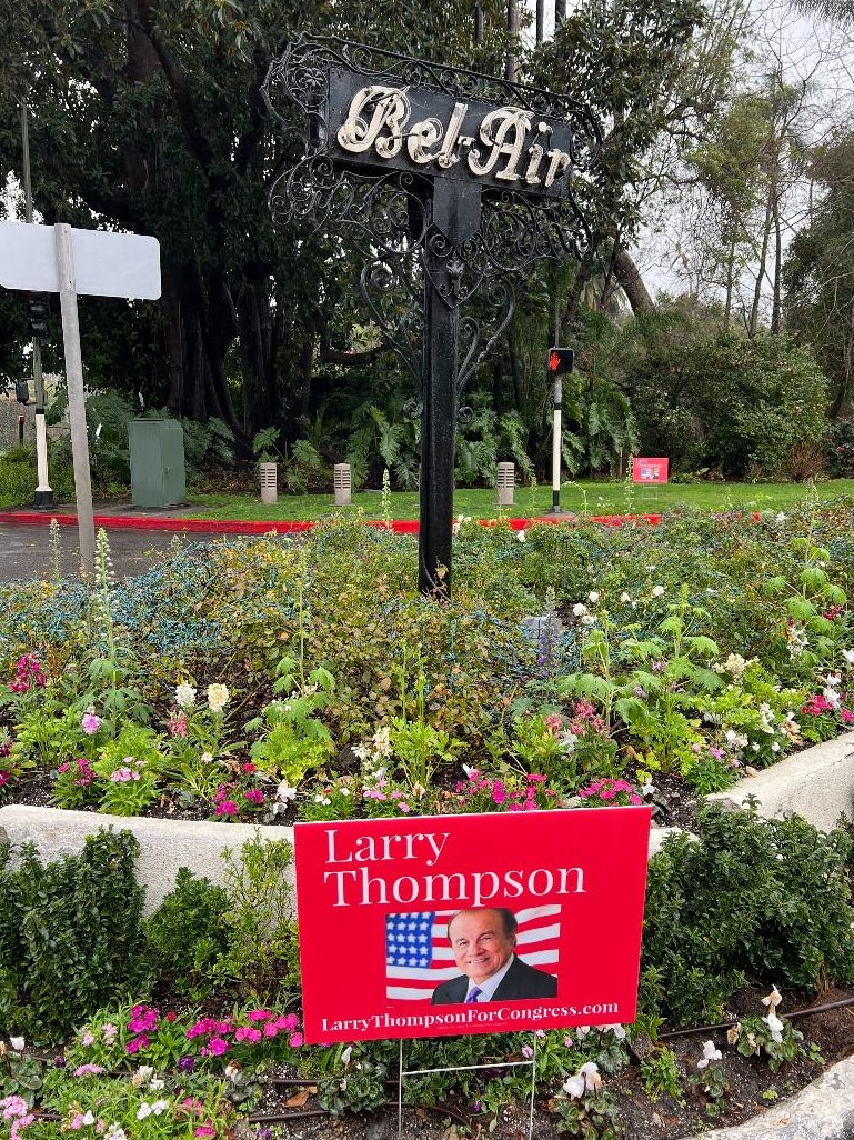 Thompson’s campaign staffers have populated, some say cluttered, multiple yard signs in the beautifully manicured lawns of the neighborhoods in his district, which include prestigious Bel-Air, Bell Canyon, Beverly Glen, Brentwood, Canoga Park, Chatsworth, Encino, Malibu, North Hills, Northridge, Pacific Palisades, Reseda, Sherman Oaks, Studio City, Tarzana, Topanga, West Hills, Winnetka, and Woodland Hills.