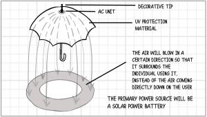 In addition, the AC Brella will have a switch conveniently embedded inside the handle frame and can be switched on and off, as well as from low air to medium air and to high air flow depending on the need. The design will ensure condensation to collect and flow on top of the umbrella and run off as with normal umbrellas during the rain. Regardless of which heating or cooling option is selected, the umbrella offers a way to keep dry and comfortable while traveling outdoors.