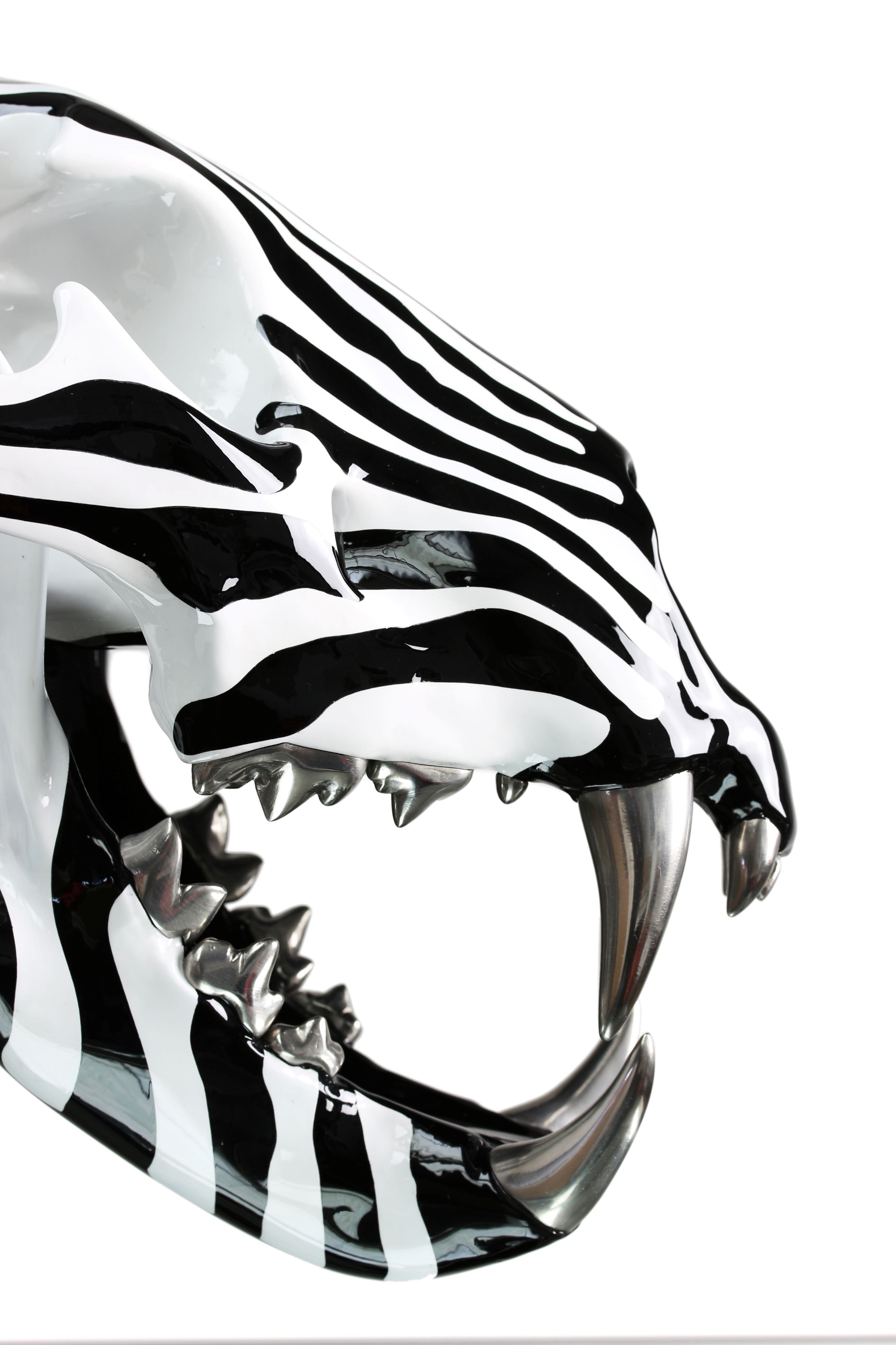 Following a police investigation and insurance due diligence after the theft, Gibson and the gallery are now appealing to the public to help find the one-off piece, Camo King, which highlights the ferocious capabilities of a lion. Distilling the majestic creature’s appearance to its core anatomy, Gibson invites the viewer to focus on the powerful jaws. Constructed from coated TB 650 pattern tooling material painted in zebra stripes, it explores methods of competition and success.