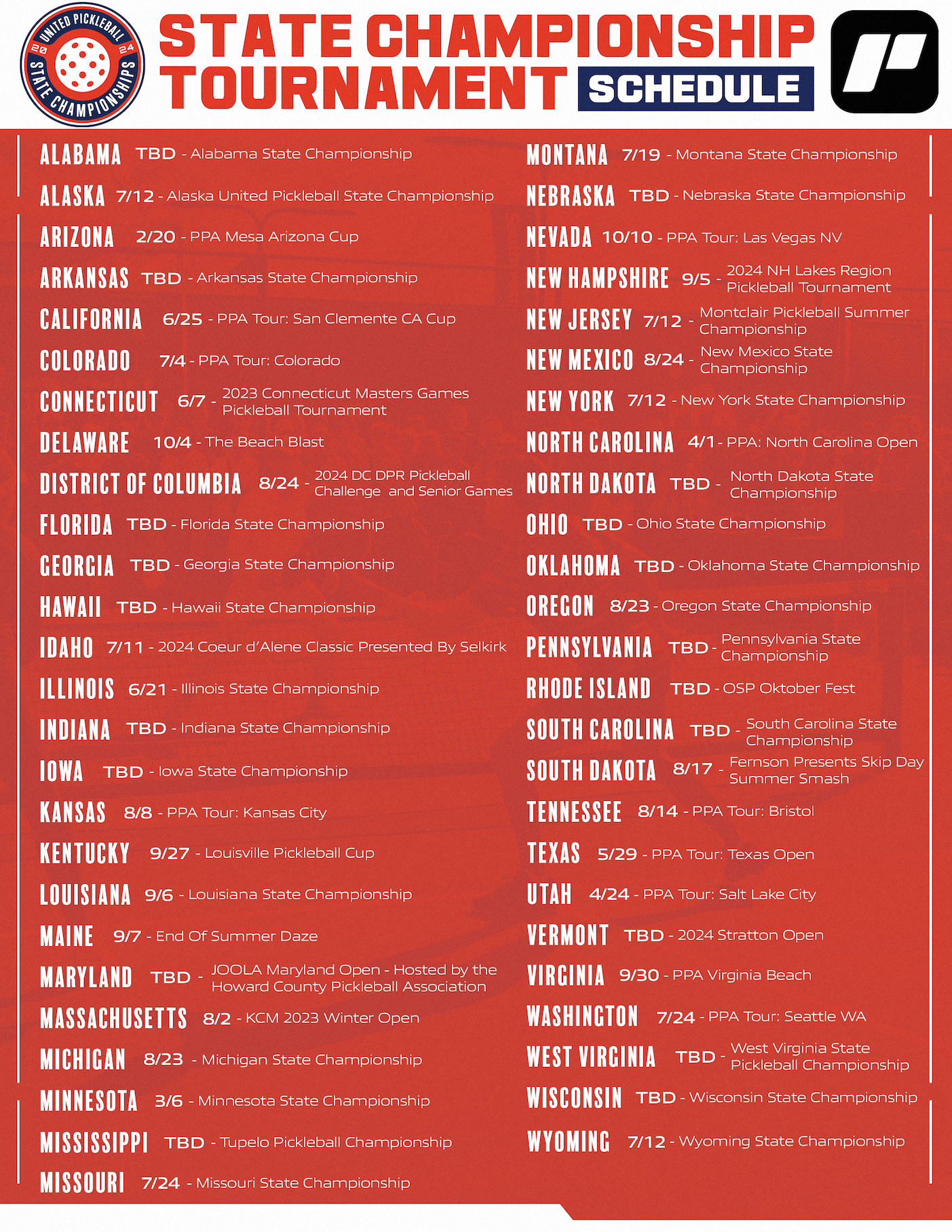 DALLAS, TEXAS, USA, February 23, 2024 /EINPresswire.com/ -- Who will become the best amateur pickleball players in each state - and ultimately earn the title of “United Pickleball Champion?” The United Pickleball State Championship Series is bringing together the premier amateur pickleball tournaments in each state and Washington, D.C. to crown State Champions across each skill level and age group. Each State Champion will qualify for the elite “Champions Division” brackets at “The United Pickleball Championships” at Brookhaven Country Club, November 4-10, 2024.United Pickleball, which is managed by Pickleball Inc., is bringing together 22 unique premier pickleball event operators across 51 events in this new championship series. Eleven will be stops on the Carvana PPA Tour.