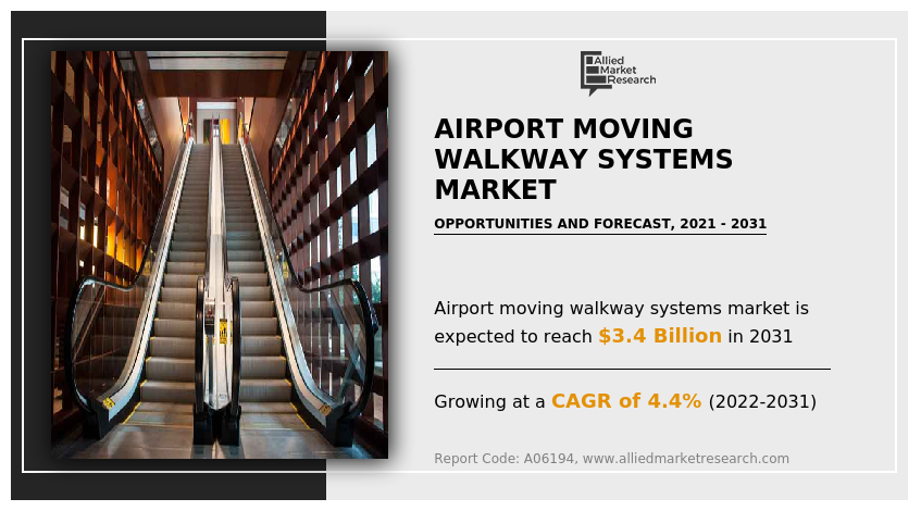 WILMINGTON, DELAWARE, February 26, 2024 /EINPresswire.com/ -- The global airport moving walkway systems market size was valued at $2.2 billion in 2021, and is projected to reach $3.4 billion by 2031, growing at a CAGR of 4.4% from 2022 to 2031. Thus, rise in new construction, expansion, and renovation of airports makes way for new installation, modernization, and maintenance of airport moving walkway systems. For instance, in October 2022, Alstom signed five-year contract with Jeddah Airports Company to provide operation and maintenance for King Abdulaziz International Airport Terminal 1.