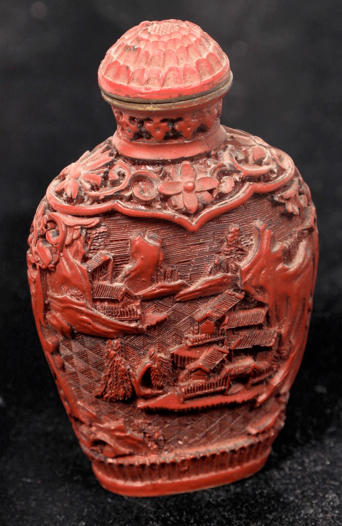 Circa 1780-1880 original carved Chinese cinnabar lacquer snuff bottle that came out of the Hotel House in Tombstone, Arizona in 1882, about 2 ½ inches tall (est. $500-$1,000).