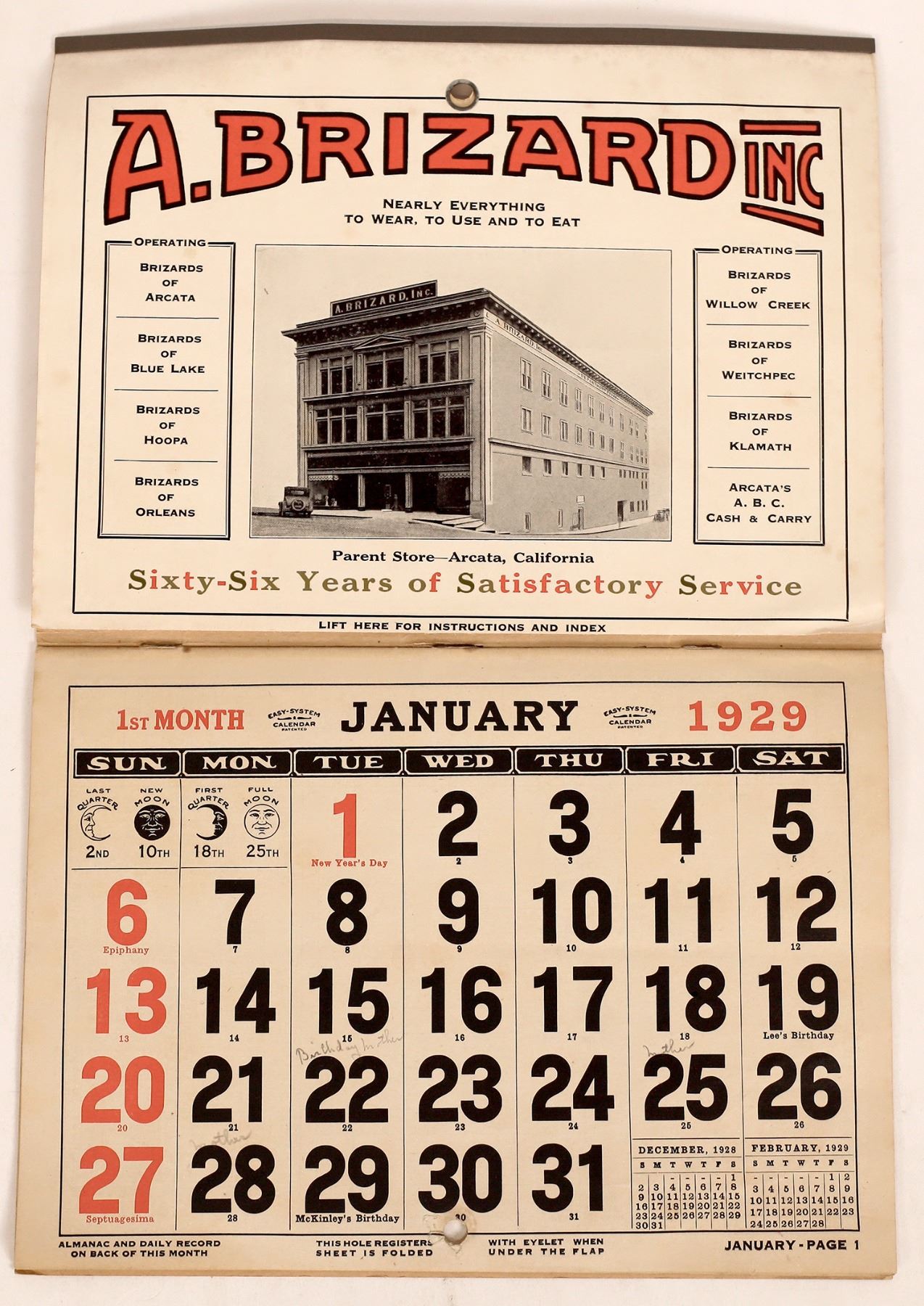A Brizard, Inc. (Arcata, Calif.) advertising calendar from 1920 (“Nearly Everything to Wear, to Use and to Eat”), 15 ½ inches by 10 ½ inches, should fetch $50-$800. Also, a group of six Mexico mining stocks spanning the years 1863-1916, including two from the Minas Prietas Mining Company, both from 1881, and one to El Dorado Mining Co., should make $300-$700.