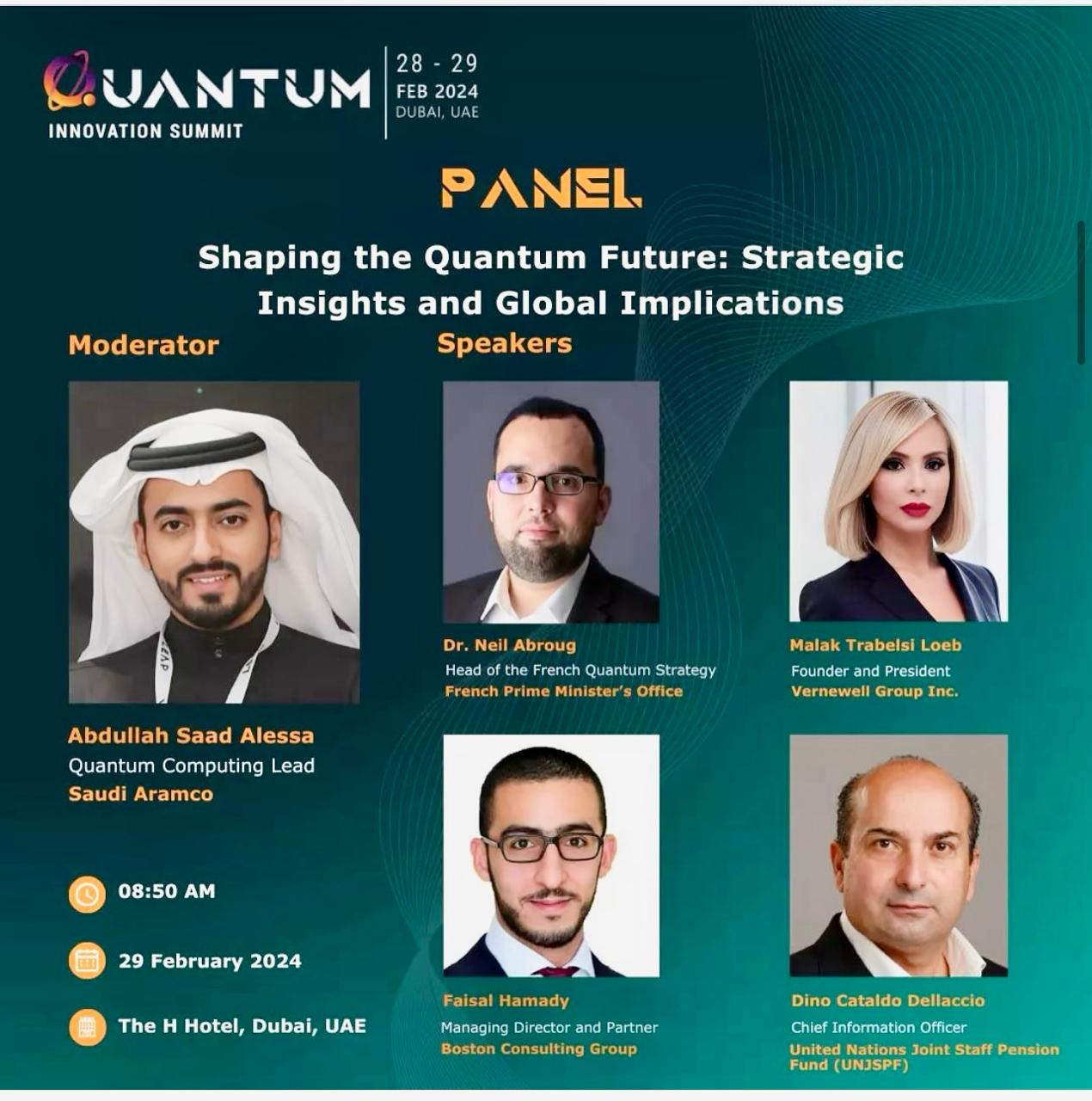 DUBAI, DUBAI, UAE, February 27, 2024 /EINPresswire.com/ -- The Quantum Innovation Summit, envisioned by Mrs. Malak Trabelsi Loeb, President of Vernewell Group Inc., is set to mark a historic milestone in the MENA region's journey into the quantum future. Scheduled for February 28th and 29th at Dubai's prestigious H Hotel, the summit is designed to serve as a dynamic catalyst for innovation, strategic partnerships, and investment, pushing the boundaries of quantum technology both regionally and globally.