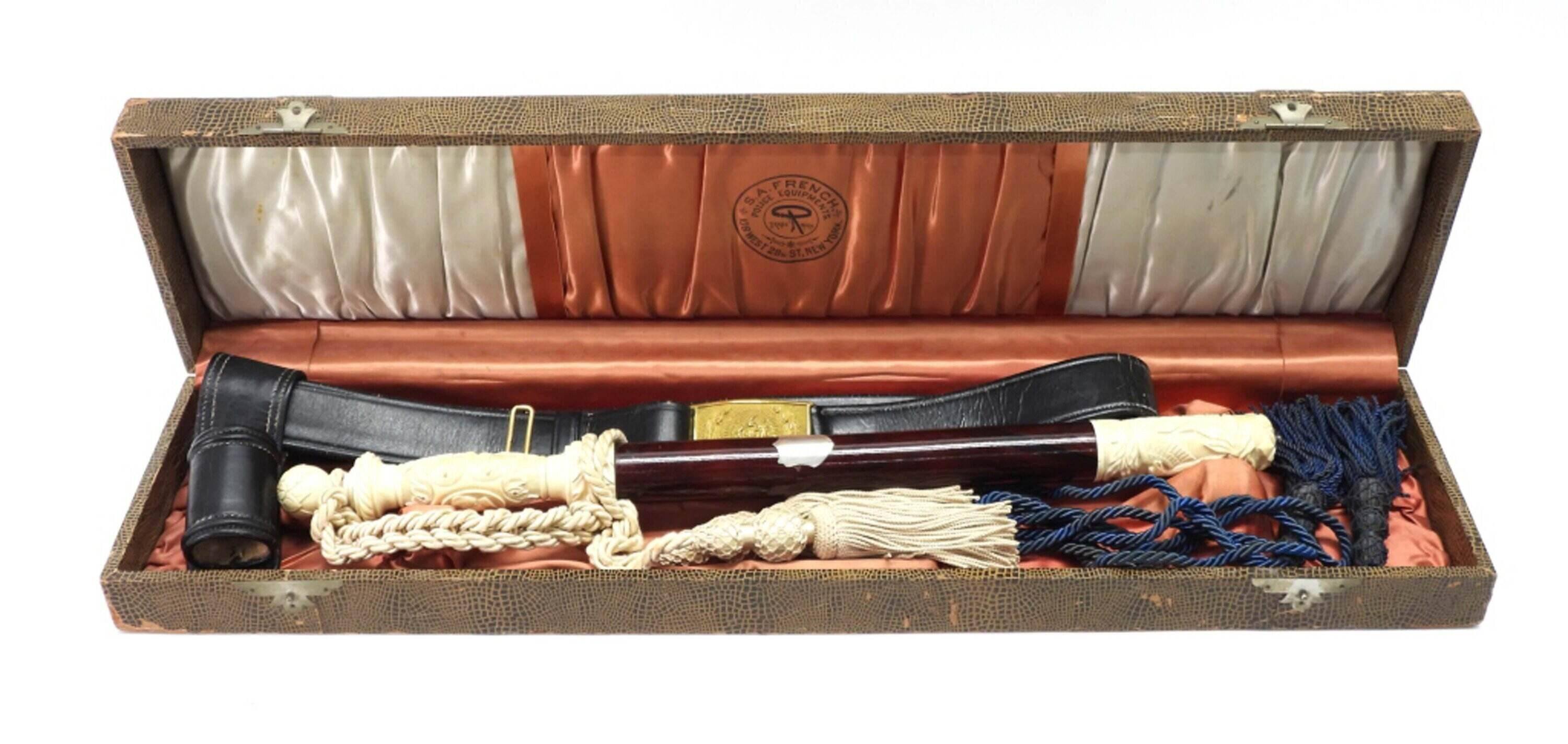 A rare set of 20th century McKenzie Steel Mitts blued steel handcuffs, patented on March 10, 1925, featuring an eight-link chain with central round link for waist chain, is estimated to bring $2,000-$3,000. Also, a 20th century S.A. French presentation police club, consisting of a leather covered wood box opening to reveal a wood club with decorative floral carved handle and top, corded rope detailing and black leather holster belt, should hammer for $800-$1,200.