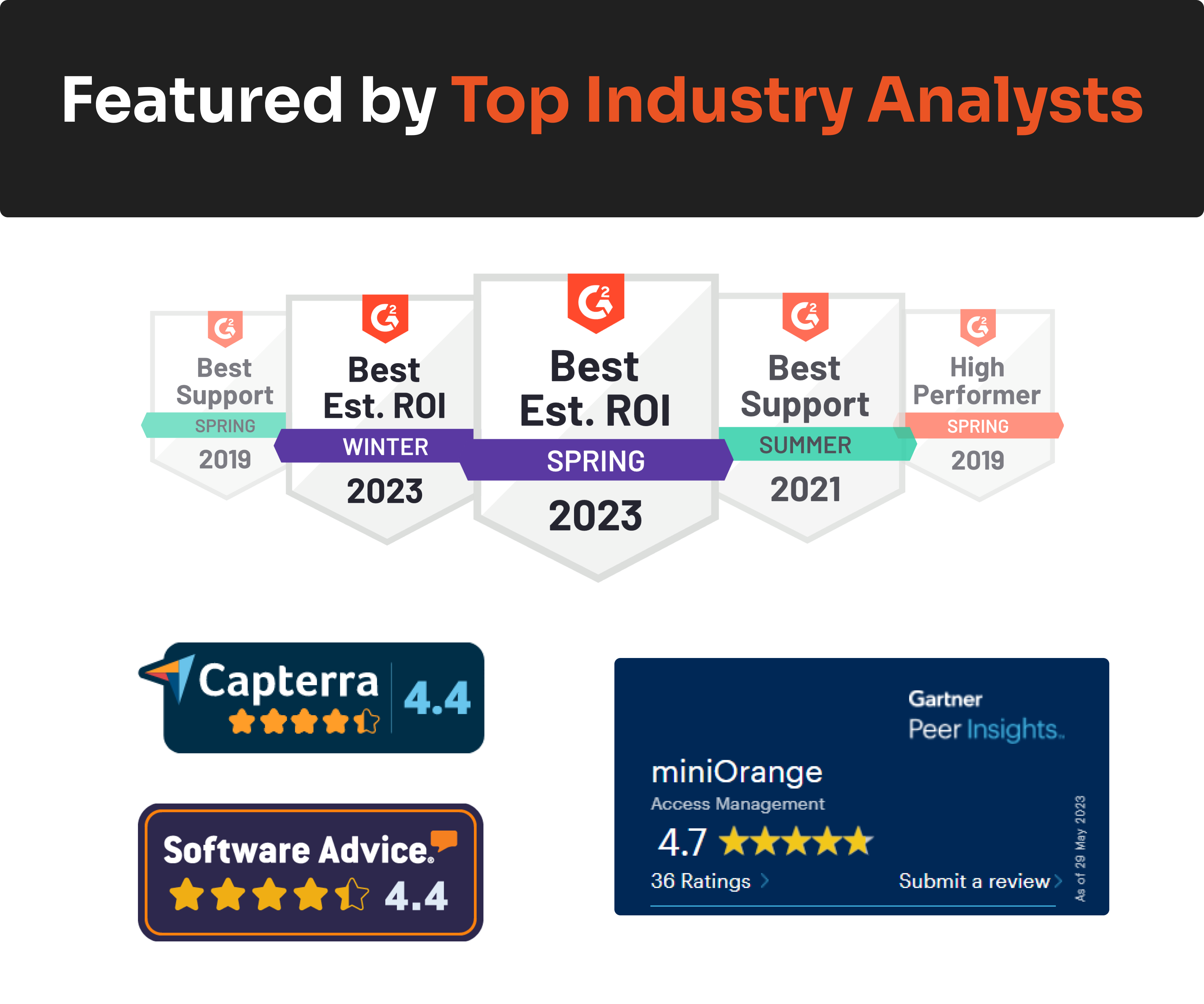 miniOrange products are one of the highest-rated Identity Management solutions on Gartner Peer Insights and have been ranked #1 on G2 for Best Estimated ROI, Best Support & High Performer multiple years in a row. miniOrange’s presence on Gartner Digital Markets extends from Capterra to Software Advice and GetApp with great reviews all over.