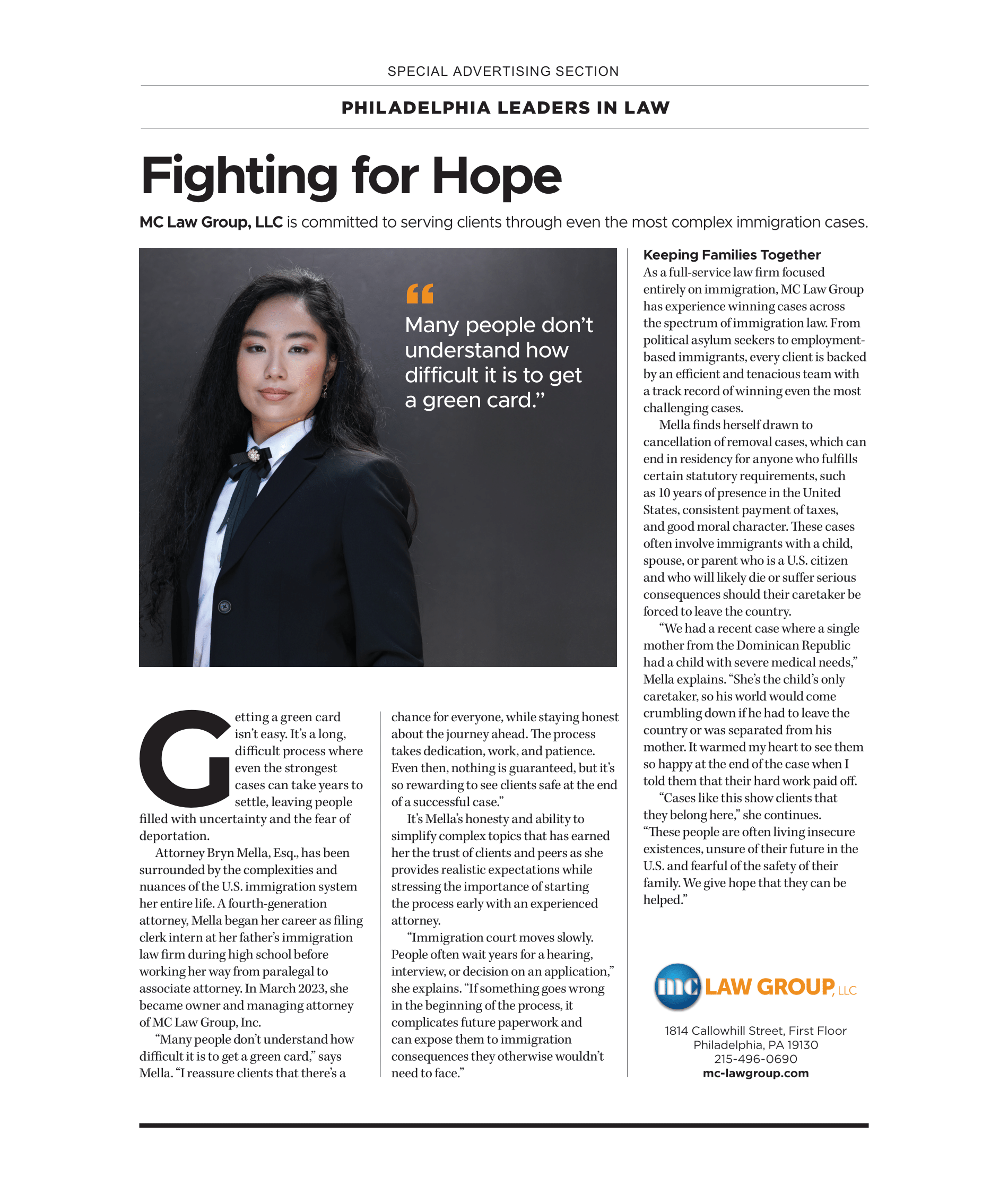 PHILADELPHIA, PENNSYLVANIA, UNITED STATES, March 5, 2024 /EINPresswire.com/ -- MC Law Group, LLC, a pioneering firm in the realm of immigration law, is thrilled to announce that their lead attorney, Bryn Mella, Esq., has been featured in both Forbes and Fortune magazines. These prestigious features spotlight Mella’s remarkable contributions to immigration law and her tireless commitment to fighting for the rights of immigrants seeking a new life in the United States.