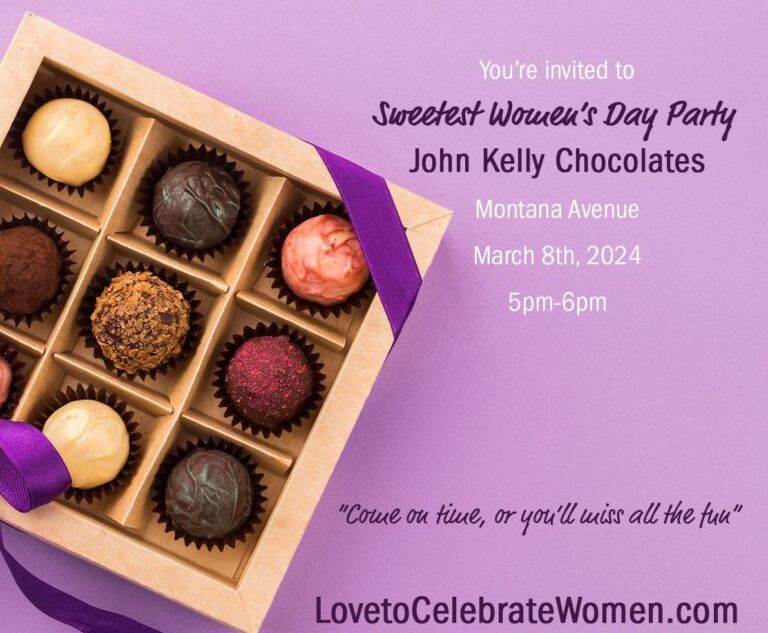 Friday 1st Sweet 1 hour social party March 8th, 2024 International Women's Day; 5pm to 6pm at John Kelly Chocolates on Montana Avenue.