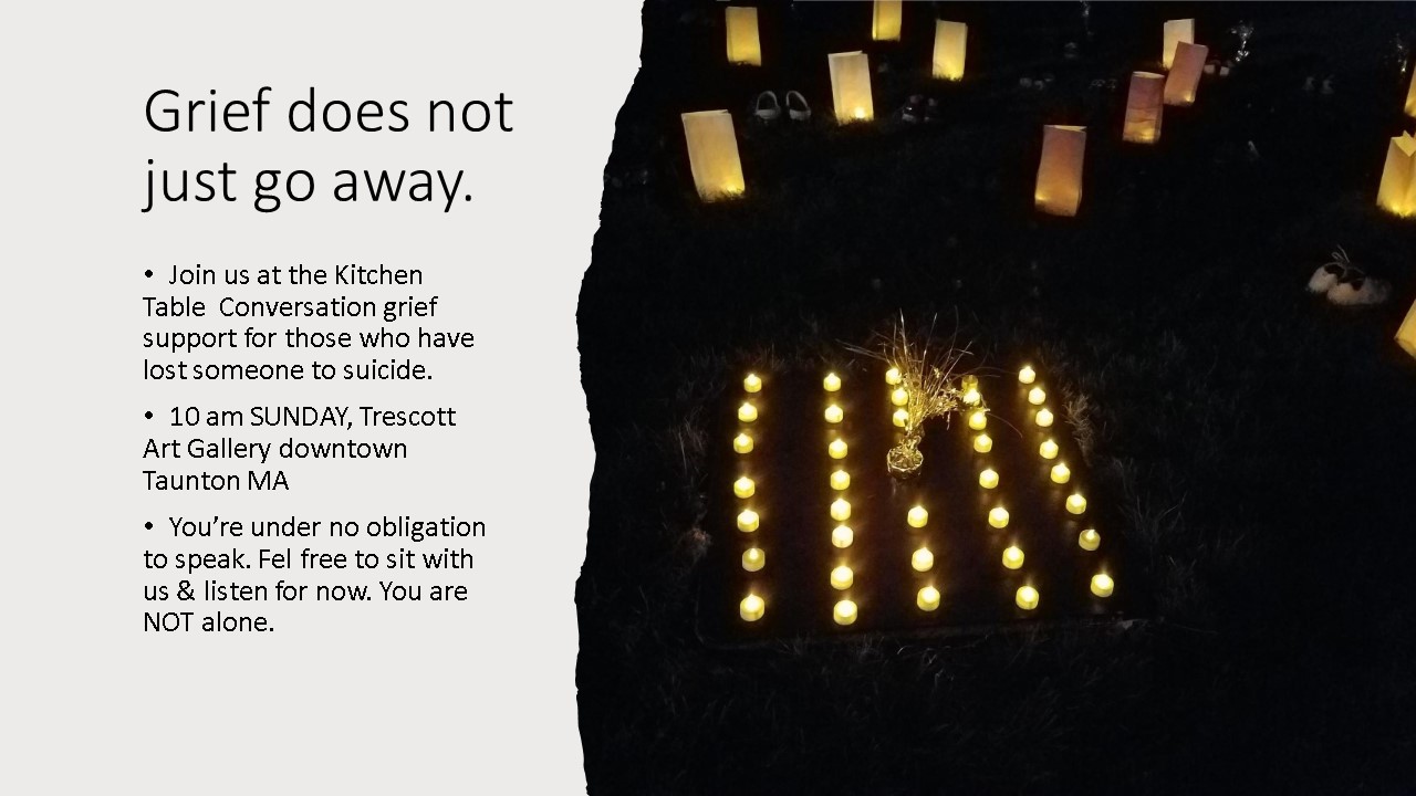 TAUNTON, MA, UNITED STATES, March 6, 2024 /EINPresswire.com/ -- Steven Palm, Bristol County (MA) suicide education and prevention community advocate and activist continues his efforts to help others transition the “Creating Hope Through Action” theme into a tangible action. The Kacie Project, a Taunton MA based non-profit continues to host monthly Kitchen Table Grief Support sessions for suicide loss survivors with collaborative support from the Bristol County Regional Suicide Prevention Coalition director Annemarie Matulis and Lived Experience Advisor Tracey Pacheco Medeiros. These in-person support sessions are held the 2nd Sunday of each month. The next session is Sunday, March 10th. The time is 10 to 11am at the Trescott Gallery located at 8 Trescott St. in Taunton MA. We will be joined by Jen Fusco Hoye, co-chair of the MA AFSP (American Foundation for Suicide Prevention)chapter board of directors, and a loss survivor. — Annemarie Matulis