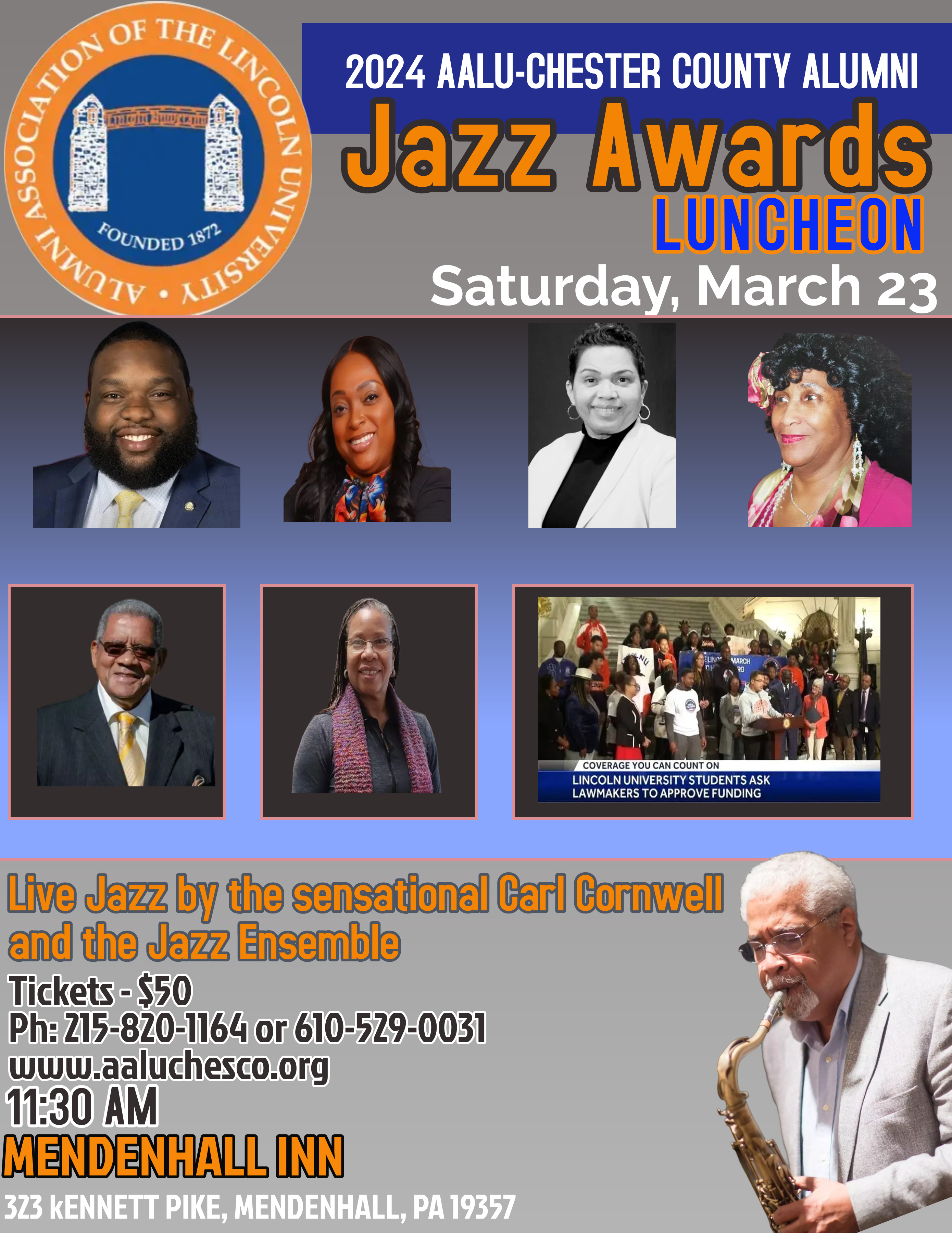 MENDENHALL, PA, UNITED STATES, March 6, 2024 /EINPresswire.com/ -- The Chester County Alumni Chapter of the Alumni Association of Lincoln University of Pennsylvania is looking forward to seeing everyone at its 9th Annual Award Jazz Luncheon, a prestigious event honoring outstanding alumni and friends of the University for their remarkable contributions to their professions, communities, and the University itself.The ceremony will occur at the elegant Mendenhall Inn, 232 Kennett Pike, Rt. 52, Mendenhall, PA, on Saturday, March 23rd, starting at 11:30 AM. Lincoln University, founded in 1854, holds the distinction of being the first degree-granting Historically Black College and University (HBCU) in the nation.