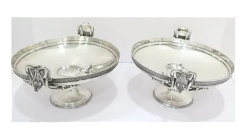 Pair of antique Tiffany & Company sterling silver footed serving bowls with ornate handles, weighing a total 46.7 toz. (est. $3,800-$5,800).