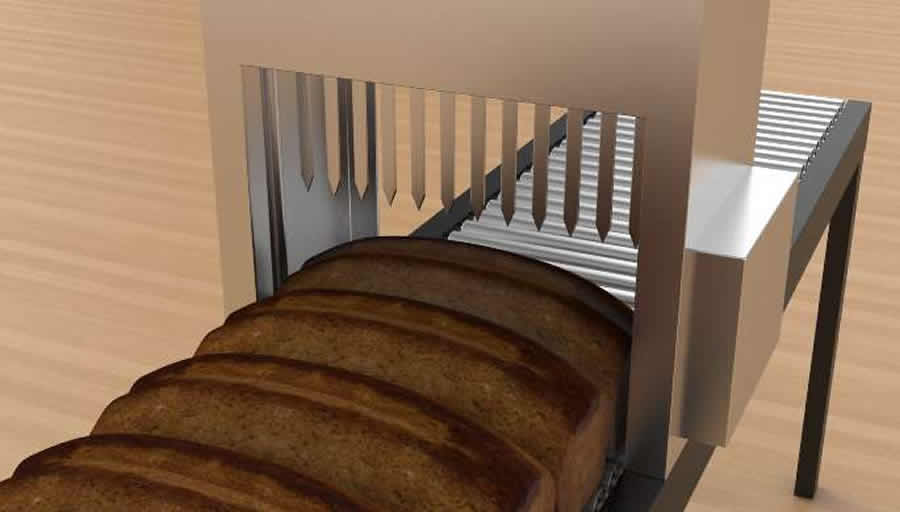 Linear bearings are used to guide the knife assembly through the loaf of bread. There is also a stop plate to secure the bread loaf in place as the knife assembly slices through the bread in a lengthwise fashion. The machinery could also feature several safety guards and alarms designed to alert workers of any malfunction.