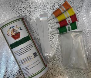 Each kit contains vibrant food color gels, disposable OodleTip pastry bags, a filling stand, gel spreaders, closure clips, use instructions, and a QR code that opens a “How To” video on a camera phone.