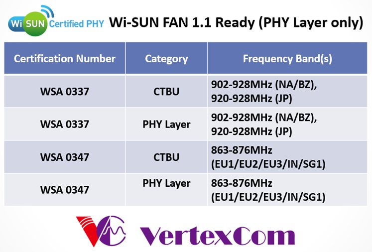 VertexCom VC735X Certified as Wi-SUN FAN 1.1 Ready (PHY Layer) 863-876MHz & CTBU, Accumulates Four FAN 1.1 Certificates