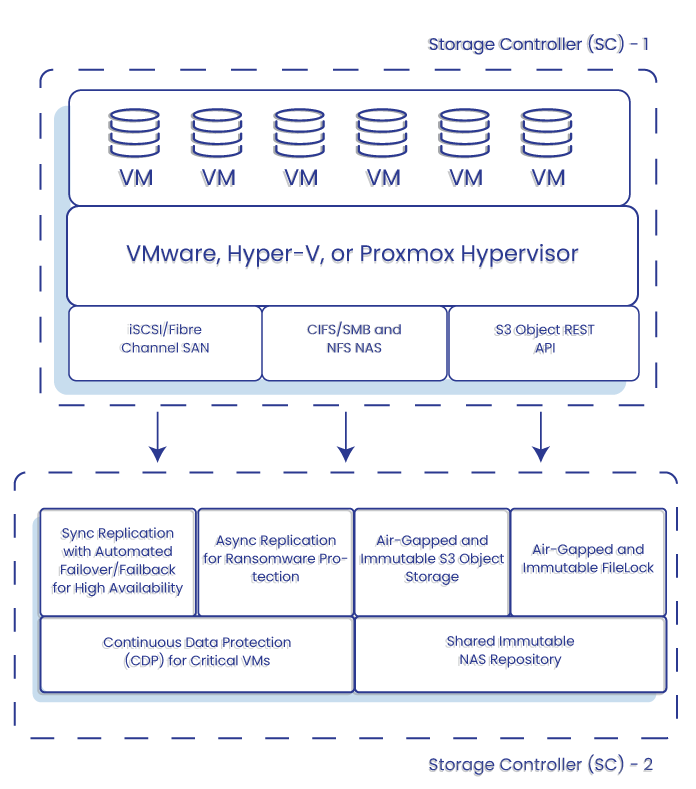 b) Secure High-Performance Storage (Target): The secondary controller (SC-2) supports flexible configurations including synchronous replication with automated failover/failback, asynchronous replication, immutable and air-gapped storage, S3 object lockdown, immutable FileLock, continuous data protection (CDP), and shared NAS repository.