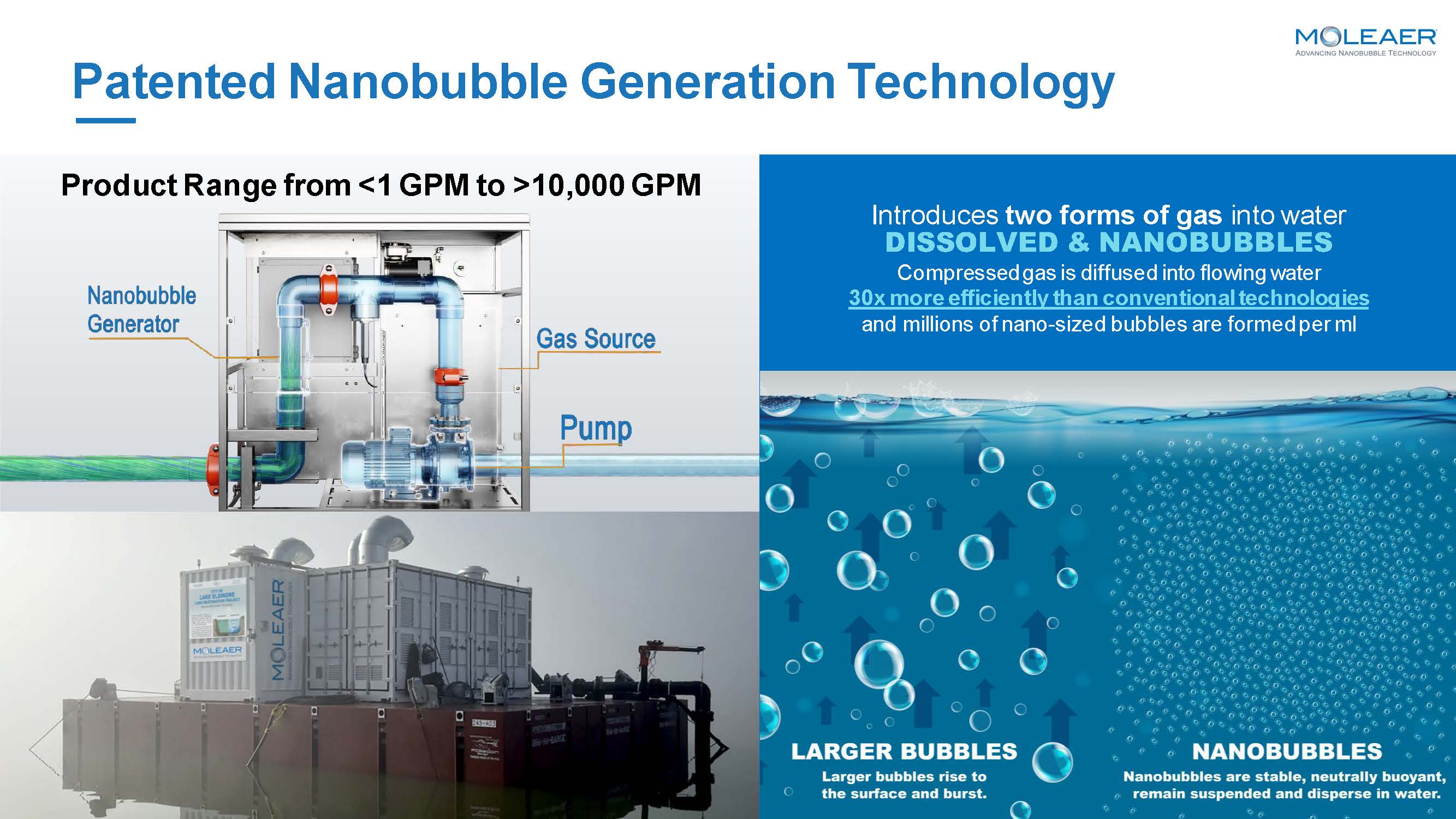Moleaer™ is the global leader in nanobubble technology with a mission to enable industries to produce more while using less water, energy and chemicals. By deploying the power of nanobubble technology, the company enhances and improves the performance and productivity of many of the world’s most critical industrial processes. Its proprietary nanobubble technology unlocks the power of water to help farmers grow more food, empowers businesses to manage water more effectively and efficiently, and restores aquatic ecosystems sustainably without chemicals.