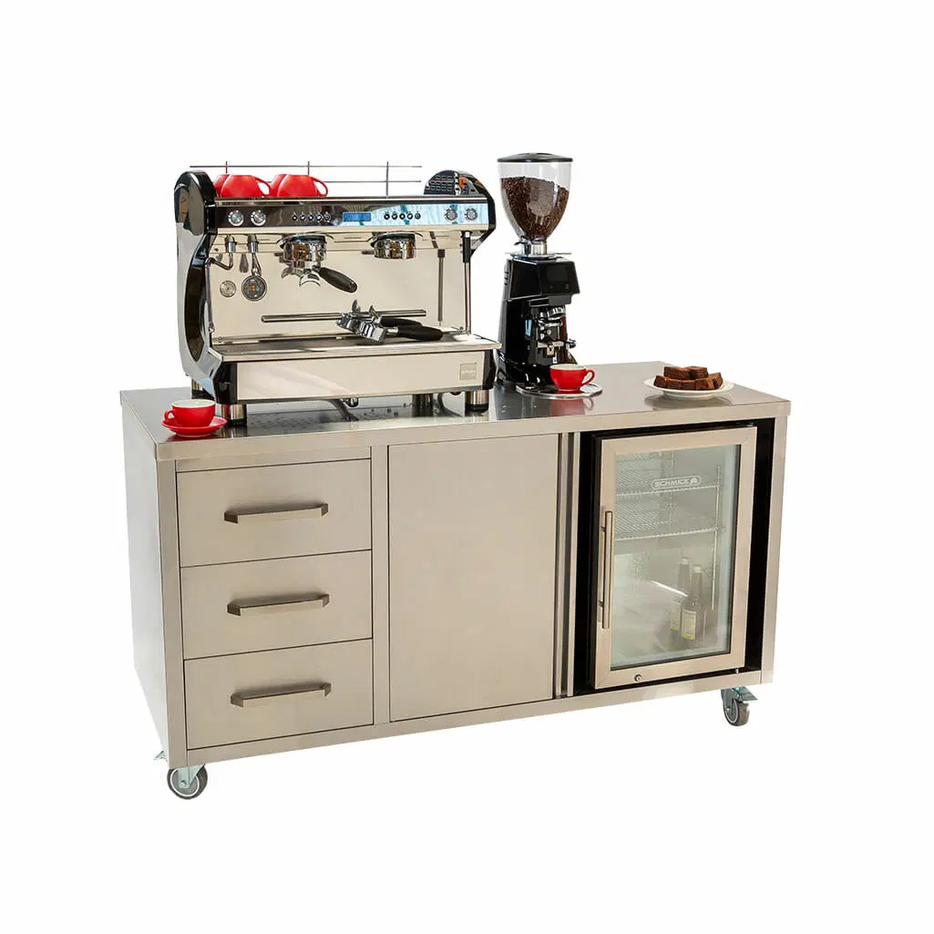 The newly introduced Stainless Steel Coffee Cart is a fully modular, robust solution crafted for businesses and entrepreneurs in the coffee industry. Featuring fully assembled construction with super strong welds, a sturdy steel door, and three solid drawers, this coffee cart is built to withstand the rigours of daily use. Additionally, the cart includes a fridge recess with rear vents, enhancing its utility and convenience for users.