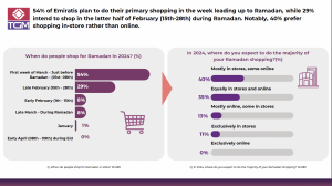 يخطط الإماراتيون عام 2024 للتسوق في شهر رمضان بوعي وحكمة. يختار الأغلبية التسوق في الأسبوع الأول من شهر مارس، قبل بدء شهر رمضان مباشرة، بينما يفضل بعض الأشخاص المبكرين أواخر شهر فبراير للحصول على ما يحتاجون إليه. على الرغم من أن العديد من الإماراتيين يتسوقون في الغالب في المتاجر التقليدية(40%)، فمن الجدير بالذكر أيضًا أن هناك العديد من الإماراتيين، ذكورًا وإناثًا، الذين يقسمون تسوقهم بالتساوي بين المتاجر وعبر الإنترنت.