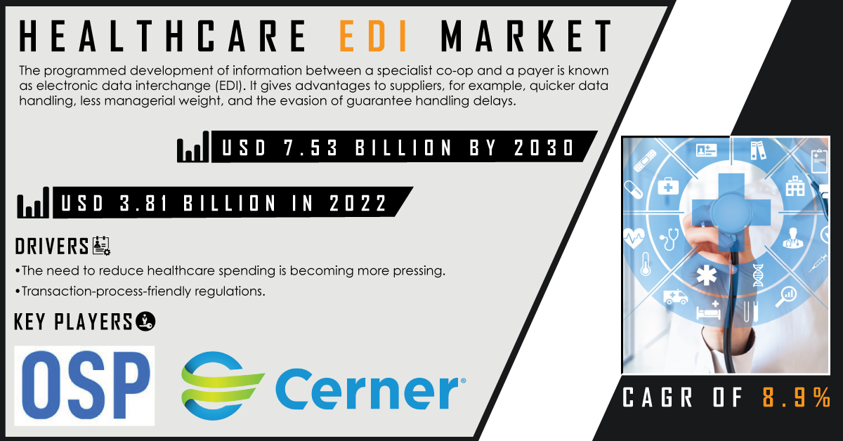 AUSTIN, TEXAS, UNITED STATES, March 18, 2024 /EINPresswire.com/ -- According to a recent market research report published by SNS Insider, the Healthcare EDI Market size was valued at USD 3.81 billion in 2022. The market is poised for robust expansion, with forecasts indicating it will reach USD 7.53 billion by 2030, exhibiting a strong Compound Annual Growth Rate (CAGR) of 8.9% during the forecast period from 2023 to 2030.Market Report Scope & Overview