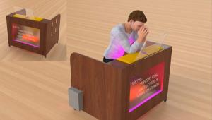There is also a frosted glass bible holder, a light, and foldable legs to offer further convenience when using Paulette’s Purpose Prayer Station. A universal audio jack with a speaker is used to play music. Storage hooks on the sides can support different items as needed. The system can be surrounded by lighting, and there may be engravings on the front of various scripture passages. Users can sit or kneel within the system for praying. The furniture unit resembles an individual church pew and offers a way for people to safely pray in churches, at home, in outreach centers, and more.