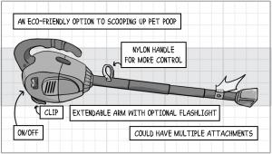 Lois R. of Wake Forest, NC is the creator of the Pet Waste Scooper, a vacuum-style tool designed to efficiently clean up solid pet waste from the ground. Users can hold the device like a leaf blower and utilize the vacuum mechanism to suction pet waste directly into a biodegradable bag for easy and convenient disposal. The device includes an extendable arm tube with a scooper on the end to help pick up the waste to be suctioned into the bags. It also features backpack straps for wearing it, and the bags that collect the content can be flushed or thrown into the garbage.