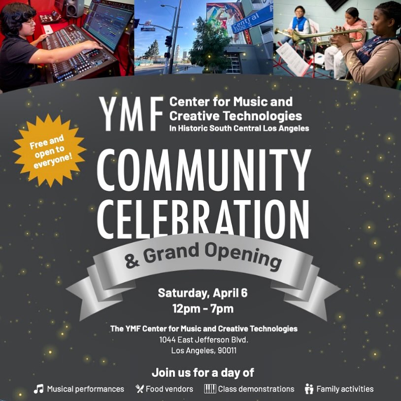 LOS ANGELES, CA, US, March 20, 2024 /EINPresswire.com/ -- On Saturday, April 6, 2024 from 12pm to 7pm the Young Musicians Foundation will hold a grand opening celebration and all-day concert marking the opening of their new program facility and headquarters, the YMF Center for Music and Creative Technologies (CMCT). The event features musical performances from across musical cultures, food vendors, family activities, class demonstrations. The YMF Center is at 1044 East Jefferson Blvd., Los Angeles, 90011. The event is free and open to the public. For information: CMCT@ymf.org“We envision the YMF Center as a vital community resource for interdisciplinary arts, and community power-building that will provide our Historic South Central communities equal access to the arts through tuition-free music and media arts classes, and economic opportunity through creative career pathways programs, and workforce development,,” explained YMF Executive Director Walter Zooi.