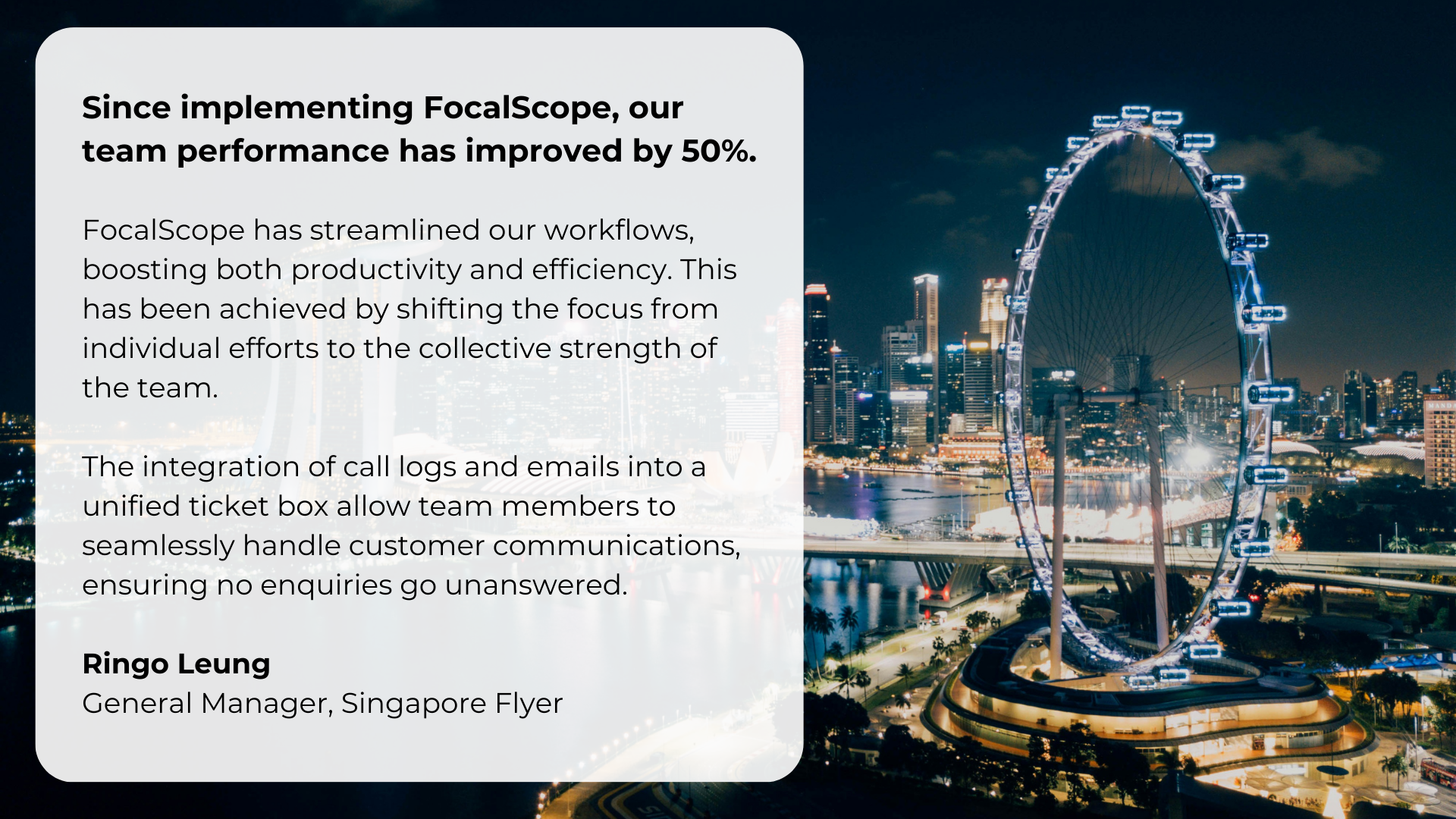 FocalScope’s secure and reliable integrated telephony and email platform helps boosts customer engagement for Singapore Flyer.
