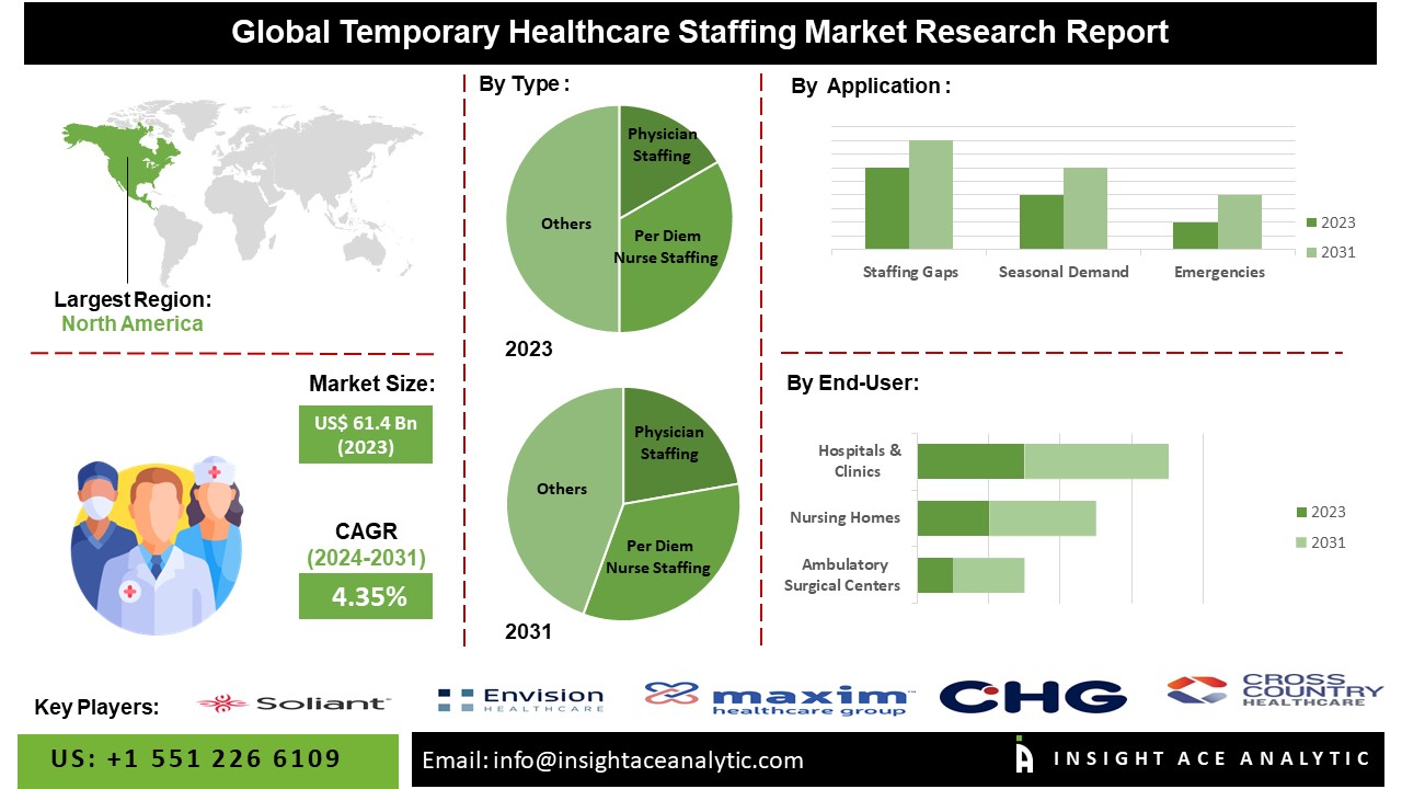 JERSEY, NJ, US, March 21, 2024 /EINPresswire.com/ -- InsightAce Analytic Pvt. Ltd. announces the release of a market assessment report on the "Global Temporary Healthcare Staffing Market – (By Type (Physician Staffing, Per Diem Nurse Staffing, Travel Nurse Staffing, Allied Healthcare Staffing (Pharmacists and Pharmacy Technicians Staffing, Therapists and Rehabilitation Professionals Staffing, Other Clinical Professionals Staffing)), By Application (Staffing Gaps, Seasonal Demand, Emergencies, Temporary Project Support, Crisis Response Teams, Telemedicine and Remote Care, Others), By End User (Hospitals & Clinics,Nursing Homes, Ambulatory Surgical Centers, Hospice Care Centers, Government Healthcare Facilities, Rehabilitation Centers, Others),), Trends, Industry Competition Analysis, Revenue and Forecast To 2031."