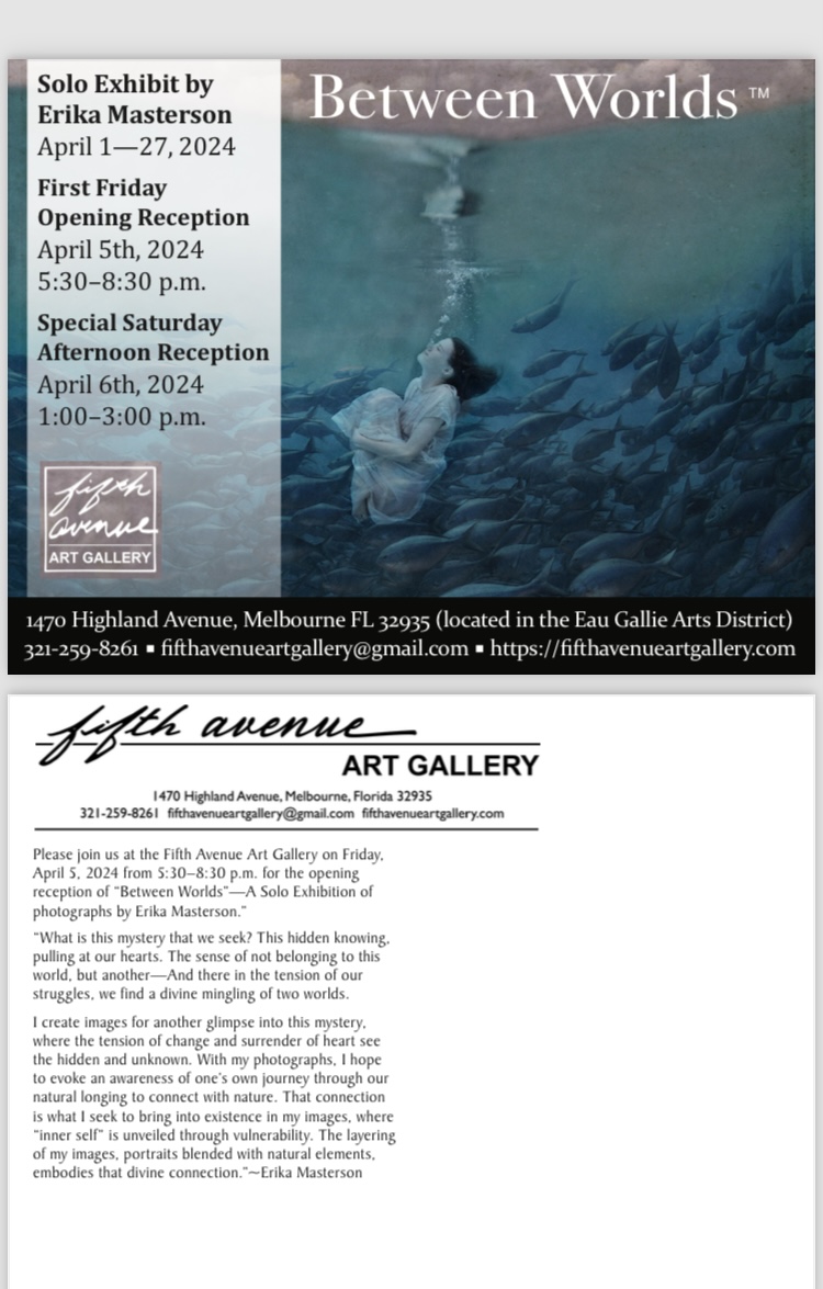 Join us at Fifth Avenue Art Gallery Friday, April 5th 5:30-8:30 p.m. Opening reception of "Between Worlds" Solo exhibition of photos by Erika Masterson