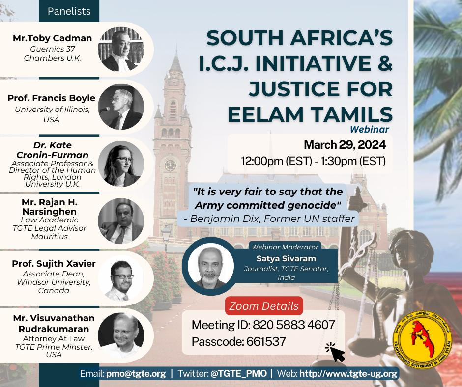NEW YORK, UNITED STATES, March 25, 2024 /EINPresswire.com/ --Transnational Government pf Tamil Eelam (TGTE) is Pleased to invite you to a Webinar joined by several distinguished international legal scholars to discuss South Africa's International Court of Justice (I.C.J. Initiative and Justice for Eelam Tamils.
