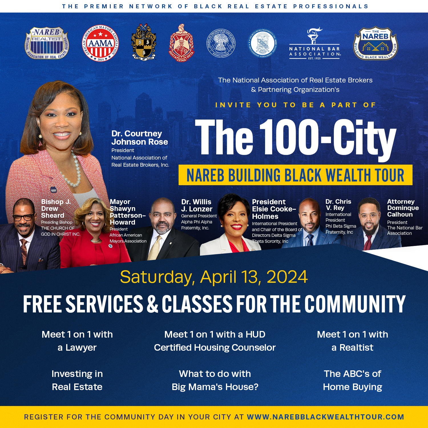 On April 13, NAREB collaborates with the Church Of God In Christ, Inc. (COGIC) and other partners for National Building Black Wealth Day. In 100 cities, in-person seminars, one-on-one sessions, and panel discussions on homeownership, property investment, starting a business, and other wealth-building opportunities will be held. An internet feed will make virtual sessions and online conversations accessible to a national audience. Register for the live stream and local events by going to www.narebblackwealthtour.com.