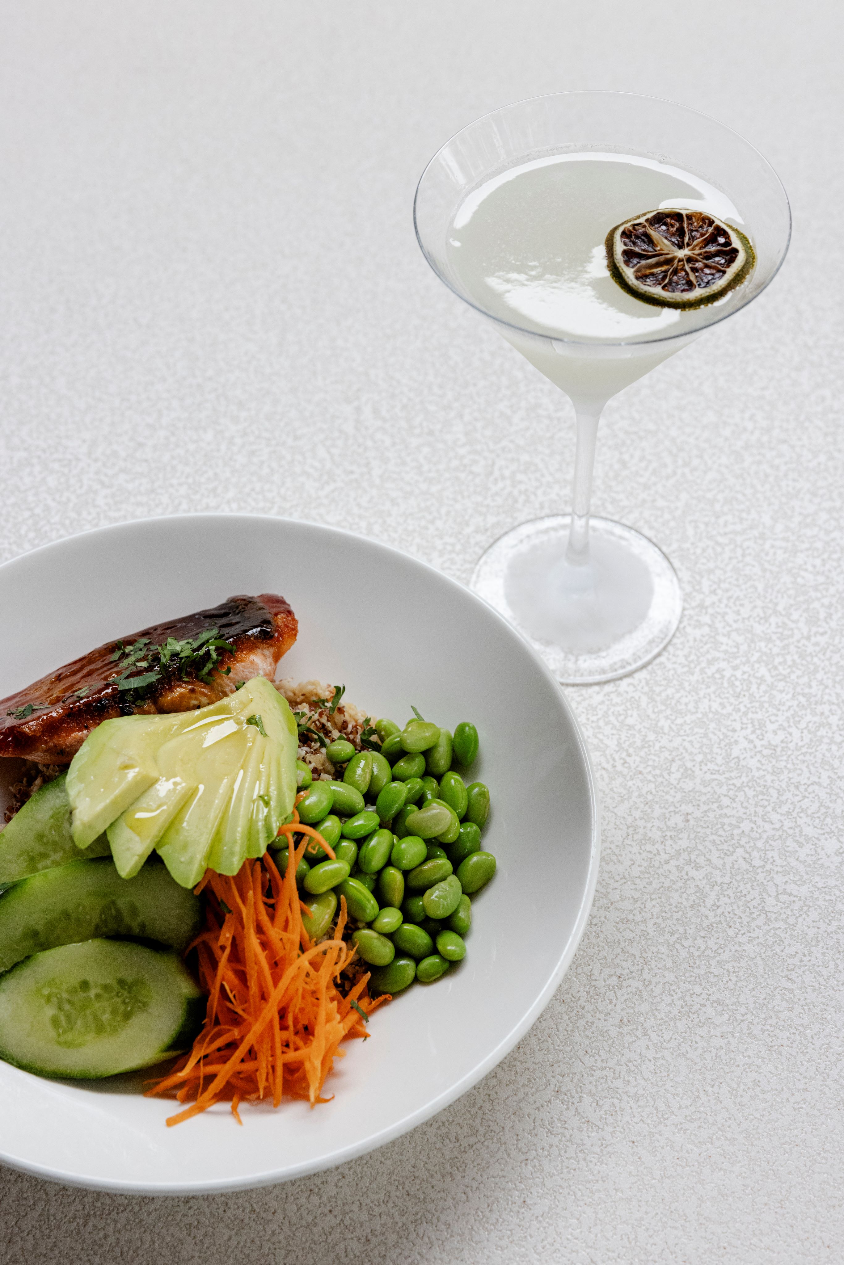 New menu items include the Wild Salmon Teriyaki Bowl. Executive chef Hollander focused on the wild-caught salmon because it is high in omega-3 fatty acids, which aid in brain health and are anti-inflammatory. The Kale Salad, high in antioxidants that protect from free radical damage and decrease inflammation, features roasted chickpeas, avocado, cranberries, pepita seeds, and watermelon radish. Also new to the menu are the Skewerless Chicken Kabobs, which offer a great source of protein for those who want to meet their daily protein requirements for weight loss or muscle building.