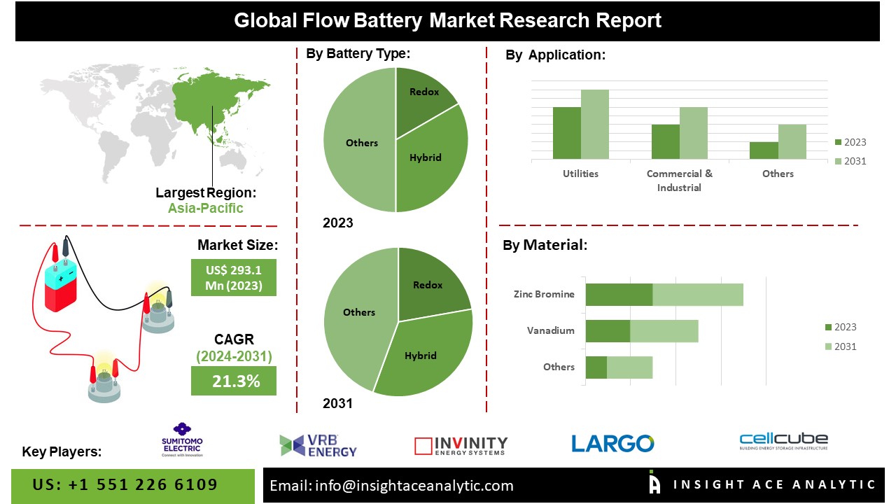 JERSEY, NJ, US, March 26, 2024 /EINPresswire.com/ -- InsightAce Analytic Pvt. Ltd. announces the release of a market assessment report on the "Global Flow Battery Market – (By Battery Type (Redox, Hybrid), Material (Vanadium, Zinc Bromine, Organic, Iron), By Ownership (Customer-owned, Third-party owned, Utility owned), Storage (Large-scale, Small-scale), Application (Utilities, Commercial & Industrial, EV Charging Stations)), Trends, Industry Competition Analysis, Revenue and Forecast To 2031."