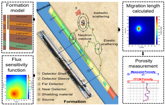 The research introduces a pioneering computational strategy, the Fast Forward Computational Method (FFCM), which revolutionizes the precision of nuclear measurements in geologically challenging environments. Central to this innovation is the method's unique ability to rapidly process and analyze data, a stark contrast to the traditional, time-consuming Monte Carlo simulations. By constructing an extensive data library of simulated scenarios, FFCM leverages perturbation theory and the Rytov approximation to model detector responses with unparalleled speed and accuracy. This modeling accounts for various environmental perturbations, effectively minimizing errors in scenarios fraught with complexity. The technique's prowess was validated through its application to neutron porosity tools, where it showcased not only its practical utility in real-world field wells but also its remarkable compatibility with existing interpretive models. This method, currently being incorporated into a leading oil company’s software platform, has been proven very useful in developing new nuclear well logging tools, while significantly enhancing the use of current nuclear tools in high angle and horizontal wells that are typically difficult to address.