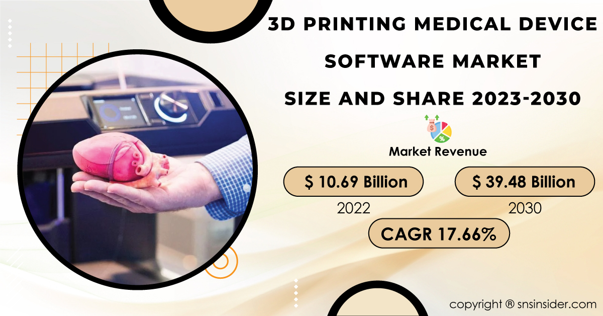 AUSTIN, TEXAS, UNITED STATES, March 28, 2024 /EINPresswire.com/ -- According to the latest market research report titled "3D Printing Medical Device Software Market By Function, End User, Type, Application, and Region - Global Forecast 2023-2030" by SNS Insider, the 3D printing medical device software market is poised for substantial growth, with projections indicating a rise from USD 10.69 billion in 2022 to a staggering USD 39.48 billion by 2030, exhibiting a robust CAGR of 17.66% during the forecast period from 2023 to 2030.Evolution of 3D Printing in Healthcare