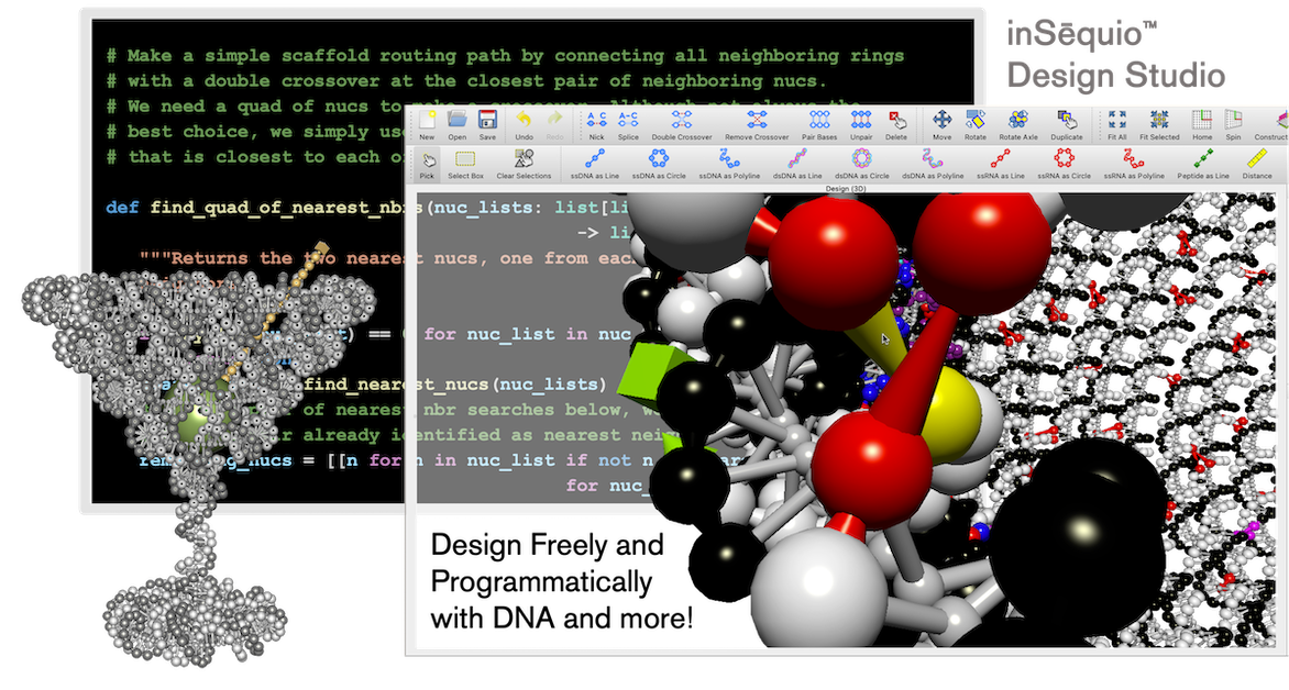 Beyond its biological use for storing genetic information, DNA excels as a nanoscale construction material due to its capacity for self-assembly, programmability, and ability to organize other molecular species. Similar to industrial CAD in automobile design, inSēquio equips nanoengineers with the tools to design and analyze complex DNA/RNA molecular devices, including biosensors, smart drug nanocarriers, and nanorobots. Unlike other design applications in the field, inSēquio provides both a 3D graphical user interface for freeform design tasks, as well as a Python application programming interface (API) for programmatic design. Together, these capabilities offer an unparalleled degree of flexibility, precision and control, which heralds a new era in the creation of structured DNA devices.