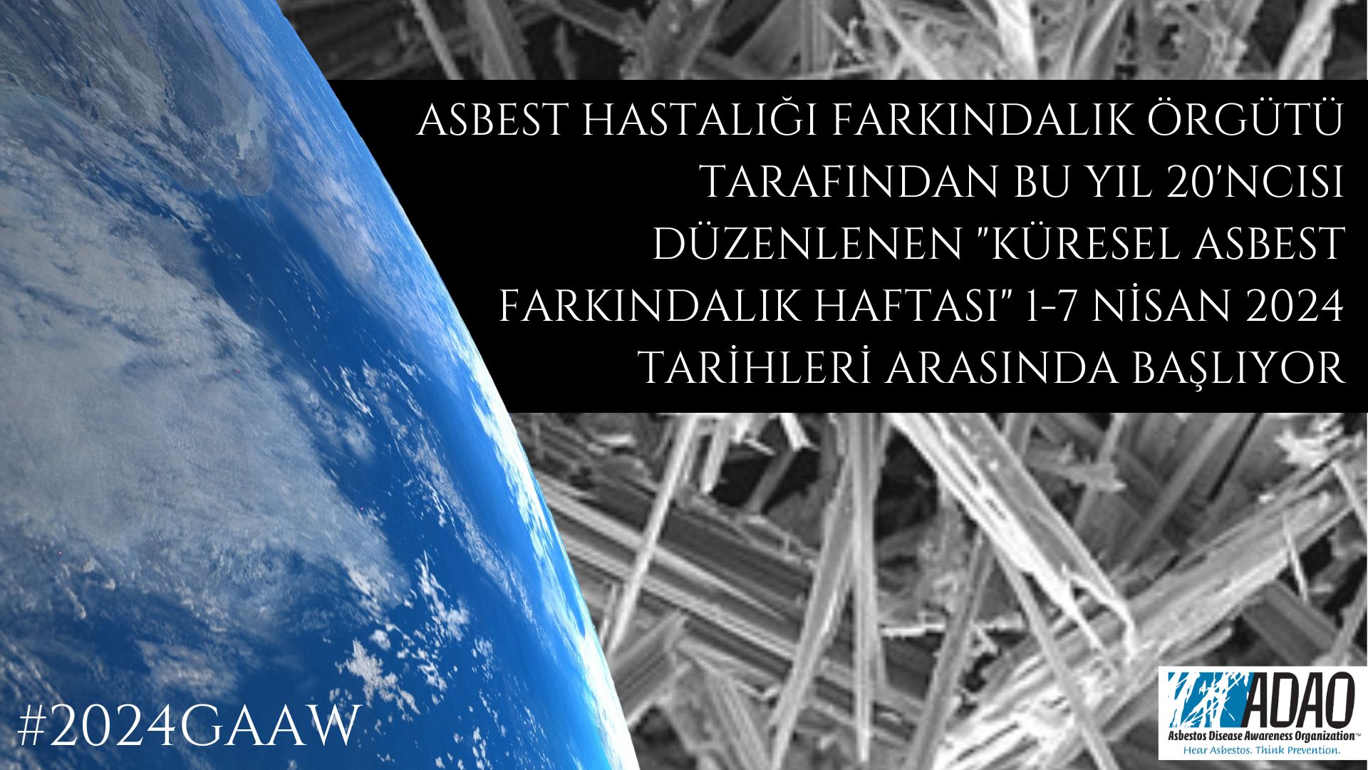 Asbeste maruz kalmayı önlemeye ve asbest kaynaklı tüm hastalıkları ortadan kaldırmaya yönelik kar amacı gütmeyen bağımsız bir kuruluş olan Asbest Hastalığı Farkındalık Örgütü (ADAO), 1-7 Nisan 2024 tarihlerinde bu yıl 20.si düzenlenecek olan “Küresel Asbest Farkındalık Haftası’nın (GAAW) kutlanacağını duyurdu.” Bu hafta boyunca ADAO ve partner kuruluşları, "İş Güvenliği ve Sağlığı Enstitüsü (ISOH) ve İngiliz İş Hijyeni Derneği (BOHS) ve dünyanın dört bir yanındaki diğer kuruluşlar, asbest madenciliği, ithalatı, kullanımı ve eski asbest türleri de dahil olmak üzere asbestten kaynaklanabilecek tehditler konusunda halkı eğitmek ve bilgilendirmek için birlikte çalışacaktır.