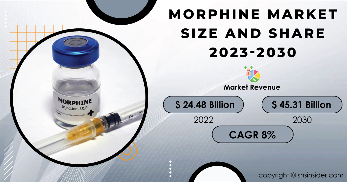 AUSTIN, TEXAS, UNITED STATES, April 1, 2024 /EINPresswire.com/ -- The global Morphine Market has been witnessing substantial growth in recent years, driven by various factors such as increasing incidences of chronic pain, rising demand for effective pain management solutions, and advancements in healthcare infrastructure.According to the latest market research report titled "Morphine Market By End User (Hospitals & Clinics, Ambulatory Surgical Centers), By Dosage Form (Injection, Oral), By Application (Pain Management, Diarrhea Suppressant, Cold & Cough Suppressant), By Distribution Channel (Hospital Pharmacies, Retail Pharmacies, Online Pharmacies), By Region, And Global Forecast 2023-2030" published by SNS Insider, the morphine market was valued at USD 24.48 billion in 2022 and is projected to reach USD 45.31 billion by 2030, growing at a compound annual growth rate (CAGR) of 8% during the forecast period from 2023 to 2030.