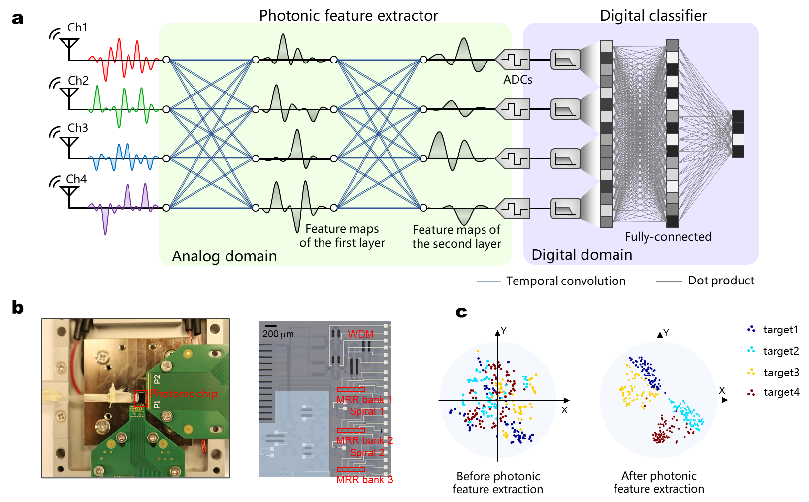 In a new paper (https://doi.org/10.1038/s41377-024-01390-9) published in Light Science & Applications, a team of scientists, led by Professor Weiwen Zou from State Key Laboratory of Advanced Optical Communication Systems and Networks, Intelligent Microwave Lightwave Integration Innovation Center (imLic), Department of Electronic Engineering, Shanghai Jiao Tong University, and co-workers have developed a photonic scheme to accomplish AFE of broadband RF signals. In principle, photonics is considered a competitive candidate for RF signal processing due to its broadband capability and reconfigurability. If the physical structure of feature extraction in implemented in the photonic circuits, the input signals can be directly transformed into features without digital processing. Based on this idea, they implemented a photonic chip that can output key features directly from the original RF signals received by the antenna. With these features, different targets are recognized with high accuracy. The reported scheme will provide a promising path for the efficient signal processing involved in autonomous driving, robotics, and smart factories.