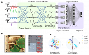 The key part of their scheme is the photonic chip. The scientists summarize the working principle of their photonic chip: “The feature extraction structure is essentially a convolutional neural network that outputs the spatiotemporal feature of the input signals. The photonic chip imitates the neural network to conduct feature extraction for the RF signals. Additionally, we designed an efficient training method especially for the photonic feature extraction system. It drastically decreases the cost of neural network training and makes the training possible.”