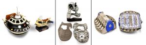 The winning entries in the 2024 AMUG Technical Competition (from left) are Coin-op Rides (Advanced Finishing), Shoulder Disarticulation Prosthesis (Advanced Concepts), and Luminaire (Members’ Choice).