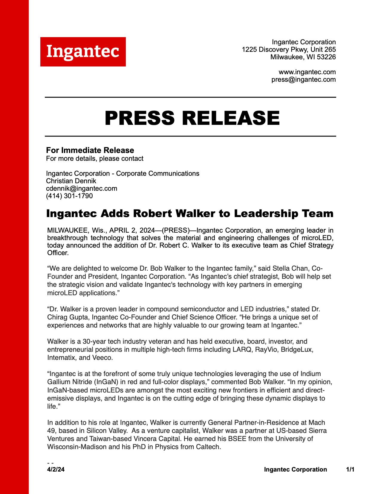 MILWAUKEE, WISCONSIN, UNITED STATES, April 2, 2024 /EINPresswire.com/ -- Ingantec Corporation, an emerging leader in breakthrough technology that solves the material and engineering challenges of microLED, today announced the addition of Dr. Robert C. Walker to its executive team as Chief Strategy Officer.