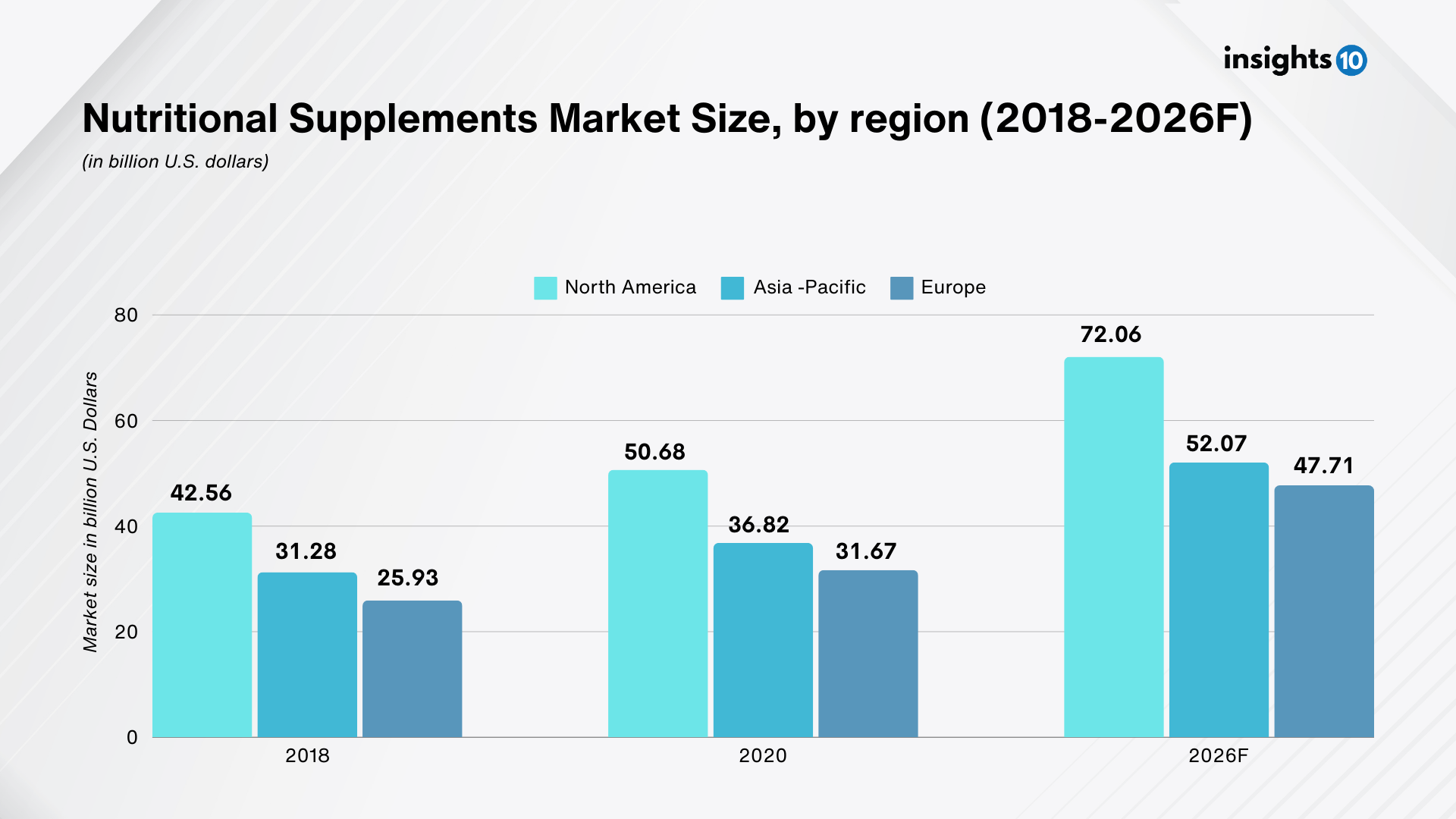 Insights10 report on 'Global Nutritional Supplements Market' suggests that, globally, vitamins & dietary supplements account for 26% of the nutraceuticals market with a major contribution from the elderly population as 88% people aged 65 or above are taking these supplements. Further, the consumption of nutritional supplements is increasing with the emergence of new trends and ‘Aesthetic Goals’, where goals are centered around physical appearance as people are becoming more conscious about their bodies and the way they look.