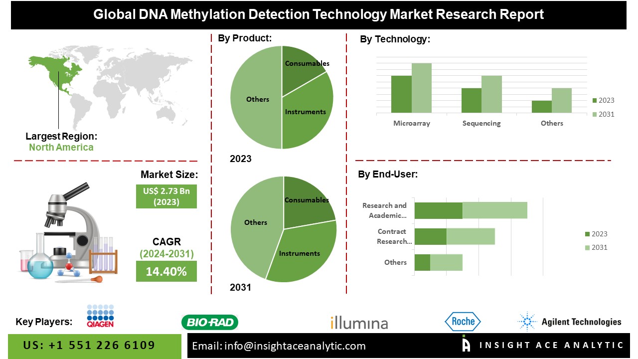 JERSEY, NJ, US, April 2, 2024 /EINPresswire.com/ -- InsightAce Analytic Pvt. Ltd. announces the release of a market assessment report on the "Global DNA Methylation Detection Technology Market- (By Product (Consumables, Instruments and Software), By Technology (Polymerase Chain Reaction (PCR), Microarray, Sequencing and Other Technologies), By Application (Translational Research and Diagnostic Procedure), By End-user (Contract Research Organization (CRO), Research and Academic Laboratories, Biopharmaceutical and Biotech Companies, And Other End User)) Trends, Industry Competition Analysis, Revenue and Forecast To 2031."