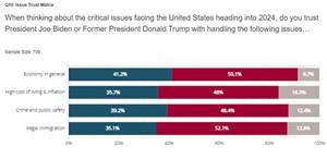 We asked the voters about critical issues facing the United States and whether they trust President Joe Biden or former President Donald Trump with the economy in general, Trump leads with 50.1% to 41.2%. 8.7% say neither candidate.