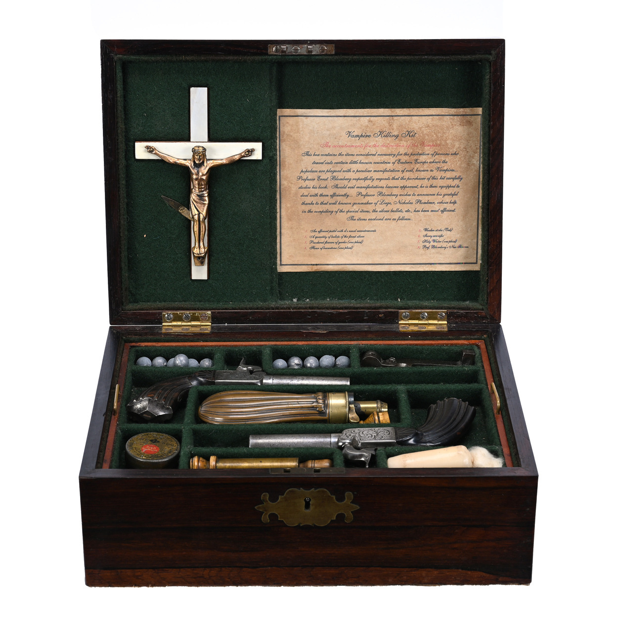 Authentic vampire killing kit, housed in a silk-lined walnut case and featuring an ebony handled dueling pistol, "silver" bullets, a wooden stake, a Crucifix and Holy Water (est. $4,000-$7,000).