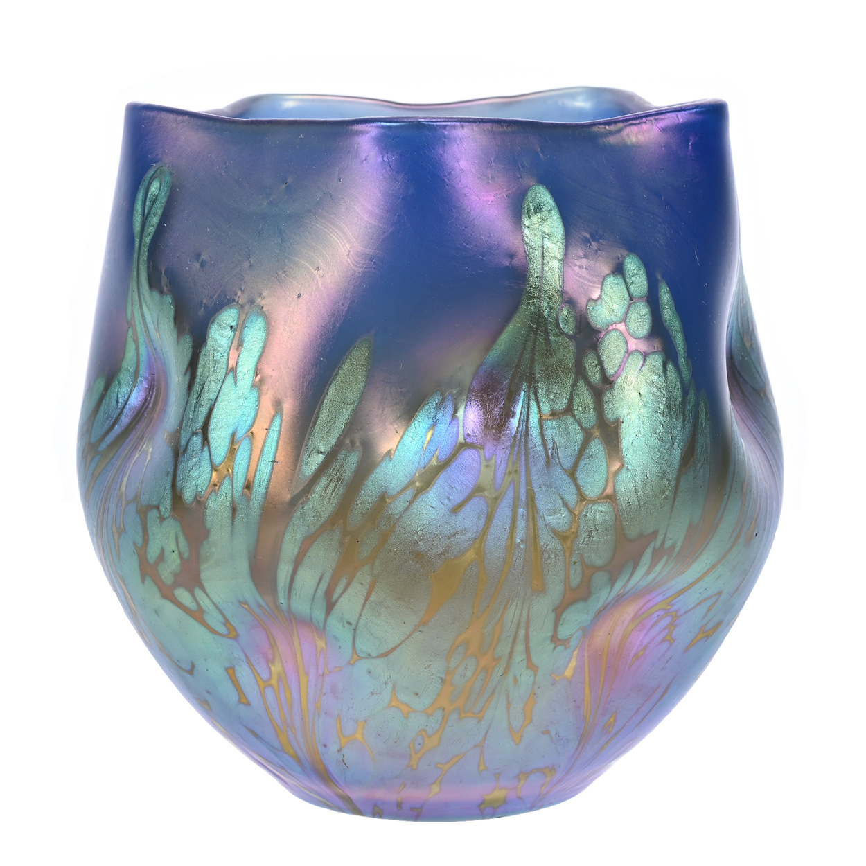 Unmarked, circa 1902 Loetz vase in the Medici pattern, blue opal with fantastic iridescence, dimpled sides and a polished pontil base, 5 ¼ inches in height (est. $2,000-$3,500).