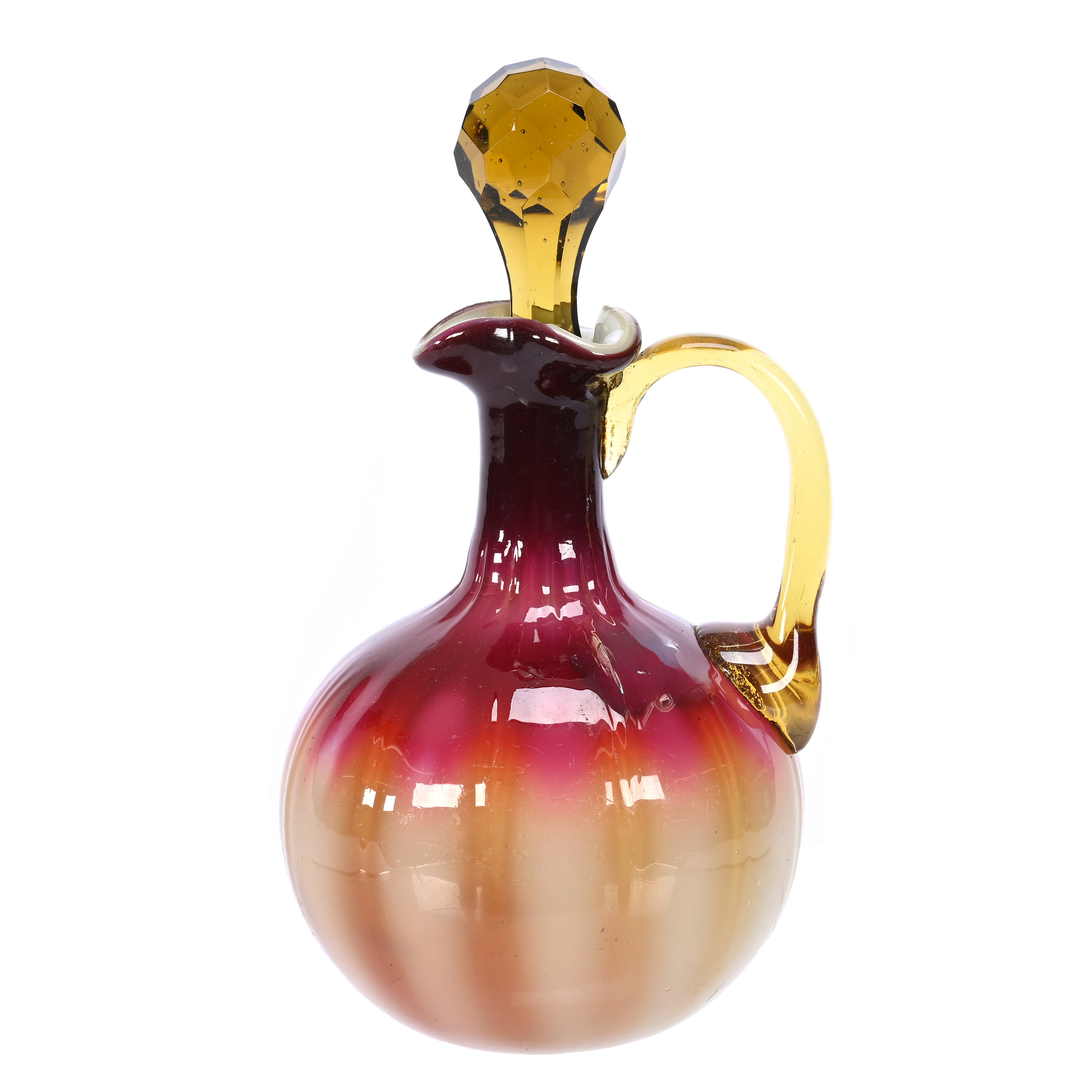 Lot 100 is an unmarked, circa 1902 Loetz vase in the Medici pattern, blue opal with fantastic iridescence, dimpled sides and a polished pontil base, 5 ¼ inches in height (est. $2,000-$3,500). Lot 53 is a plated amberina art glass cruet by New England Glass, 6 ¾ inches tall, with a perfect handle and a polished pontil base, from the collection of Frank and Melissa Keathley (est.$1,500-$3,000).