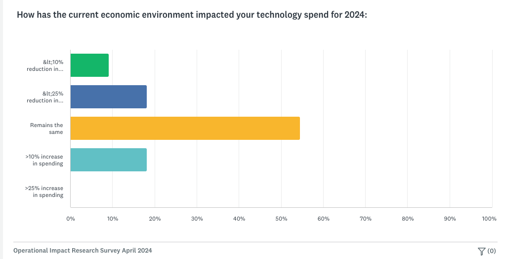 Despite economic headwinds, 54.55% of respondents report their technology spending remains unchanged, highlighting a strategic commitment to innovation amid budgetary constraints. A notable 18.18% are even increasing their tech budgets, aiming to harness technological advancements for competitive advantage.